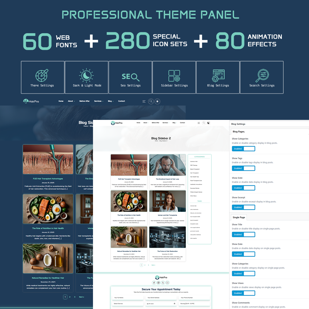 HairPro includes an intuitive theme settings panel, providing total control over every aspect of your website’s design and functionality. Here’s what you can customize: