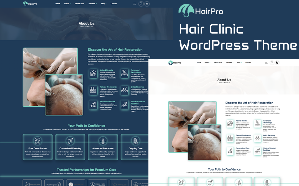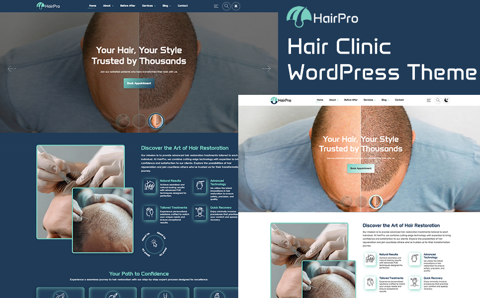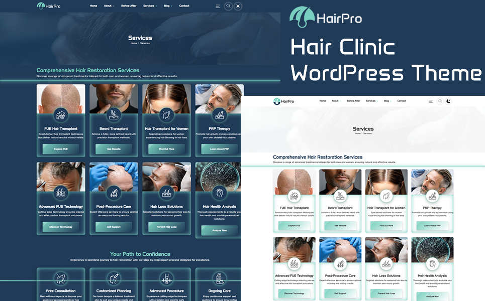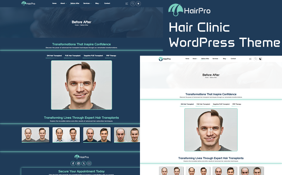 HairPro is not just another WordPress theme; it is a revolutionary solution designed specifically for hair clinics, hair transplant professionals, and businesses in the hair restoration industry. Built to meet the unique needs of this growing sector, HairPro seamlessly blends sleek aesthetics with robust functionality to help you showcase your services and expertise effectively. Whether you specialize in FUE hair transplants, beard restoration, PRP therapy, or women's hair solutions, HairPro empowers you to create a captivating online presence effortlessly.
