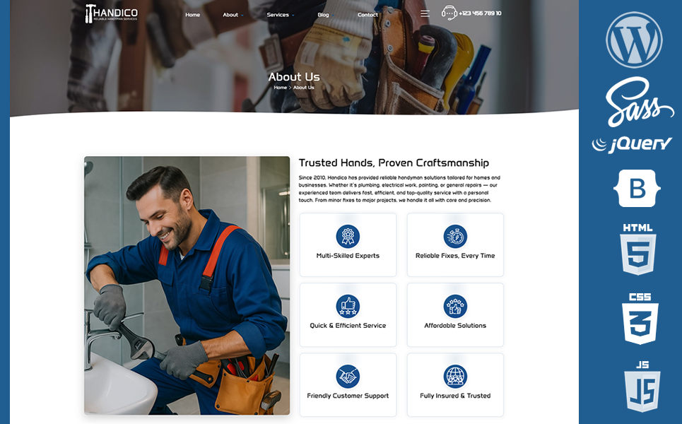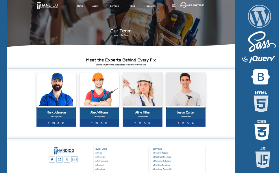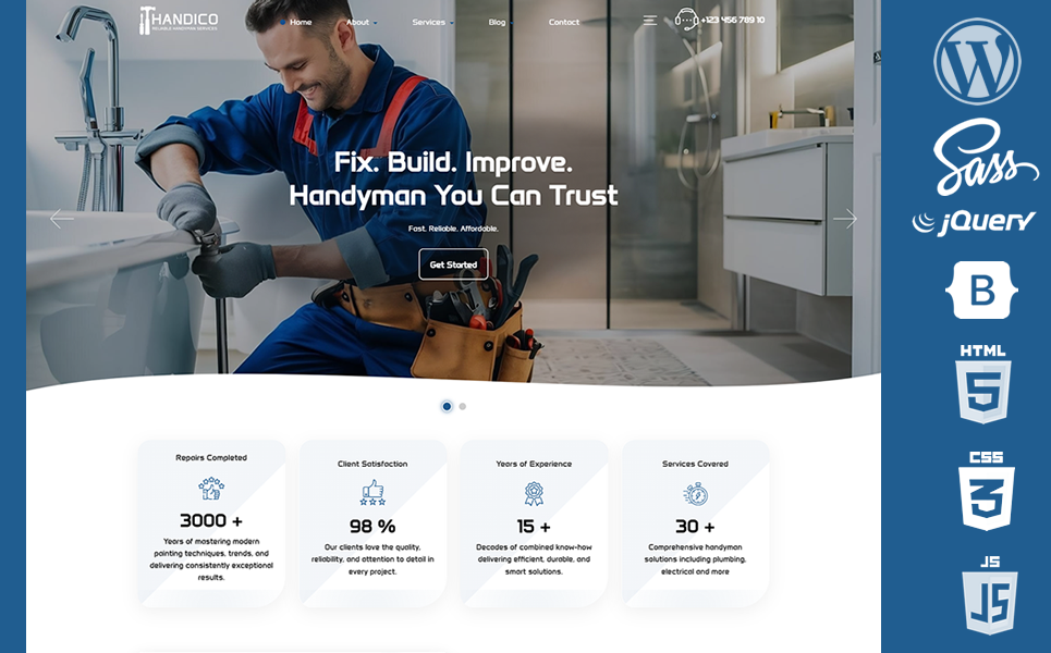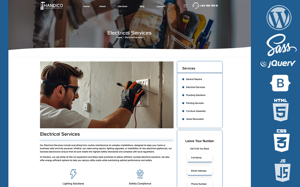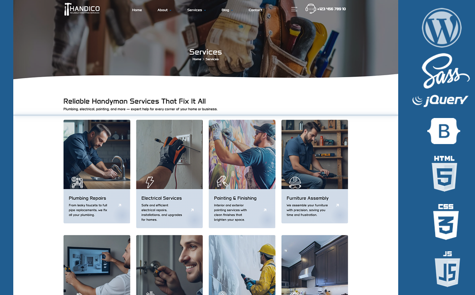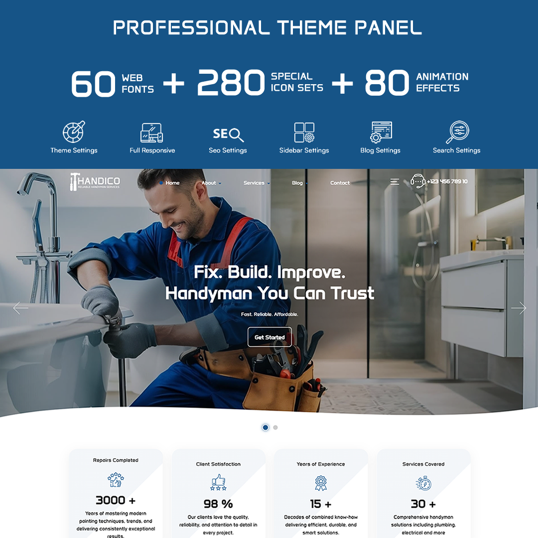 Handico is a modern, fully customizable WordPress theme designed specifically for handyman services, home repair professionals, electricians, plumbers, painters, and other service providers. It offers a perfect blend of performance, speed, and flexibility to help you create a stunning website without any coding knowledge. The theme features a user-friendly settings panel where you can easily upload logos, customize colors and fonts, manage social media links, and configure contact details.