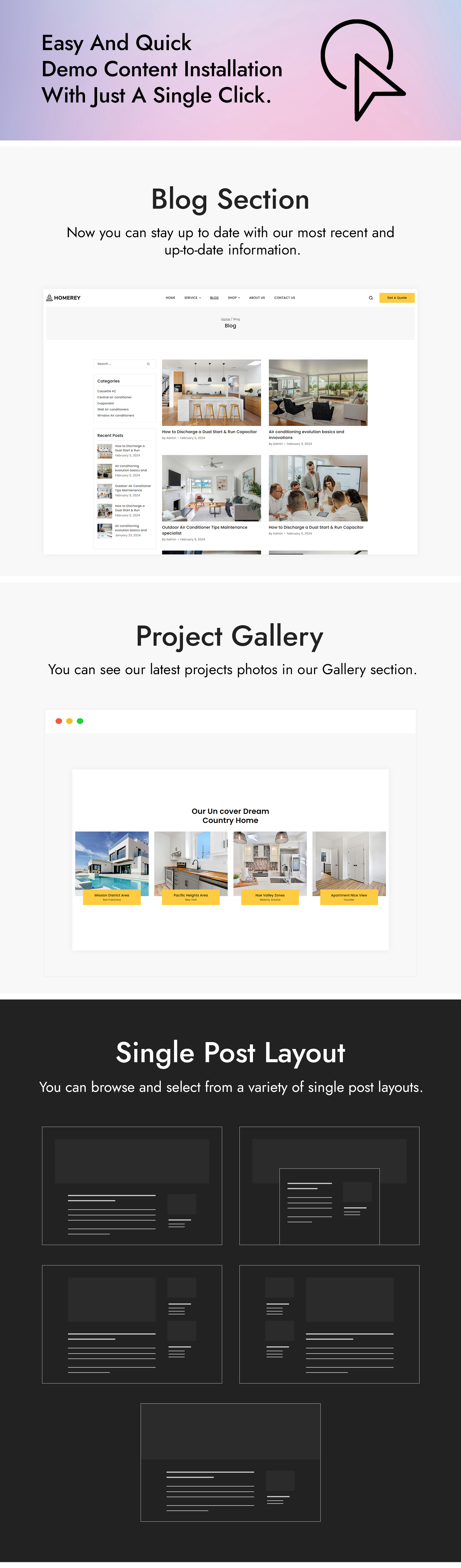 Realestate businesses looking to create a lasting online services, the Homerey theme is best choice. Its look like sleek, contemporary includes excellent photographs, online maps, and comprehensive listing data with all real facts. Easily add new listing features, highlight promotions, and create feature rich agent websites services with customizable layout. Homerey theme claims that it works perfectly with every devices because it is completely responsive layouts. Strong sorting and filtering tools enhance the user experience through rendering it easier for users and real customers to locate residences and workplaces. Increased leads and sales are the outcome of the Homerey theme's integrated SEO optimization and compatibility with popular plugins, which guarantee outstanding visibility and faultless functioning.