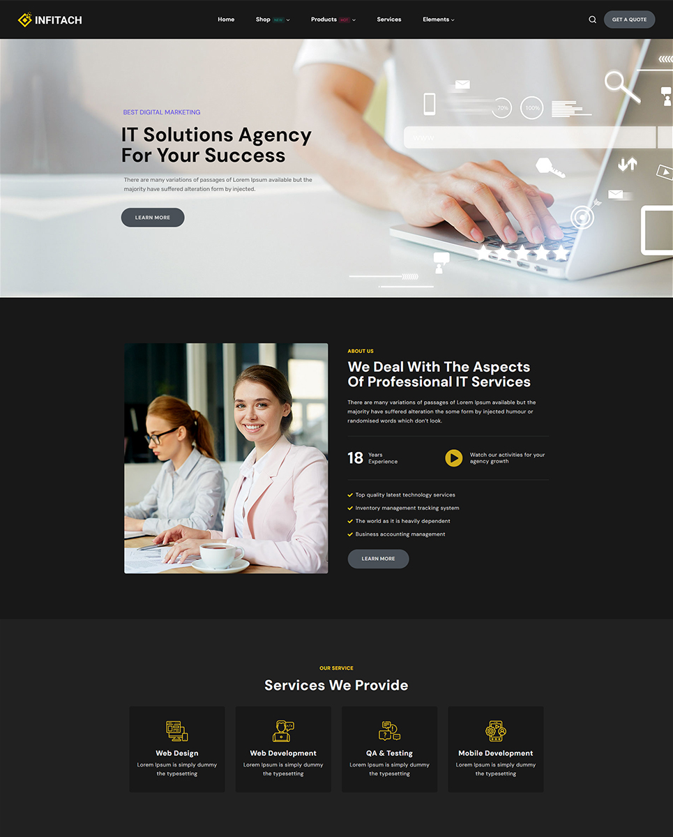 The Infitach WordPress theme is the ideal layout for your IT Solutions and Services Company website. It is easy, flexible, and powerful. It is also appropriate for start-up businesses and websites relating to marketing, consulting, and agencies. The theme includes all the features needed for an IT solutions and services business, including a project gallery, services, client feedback, blog section, and contact form.