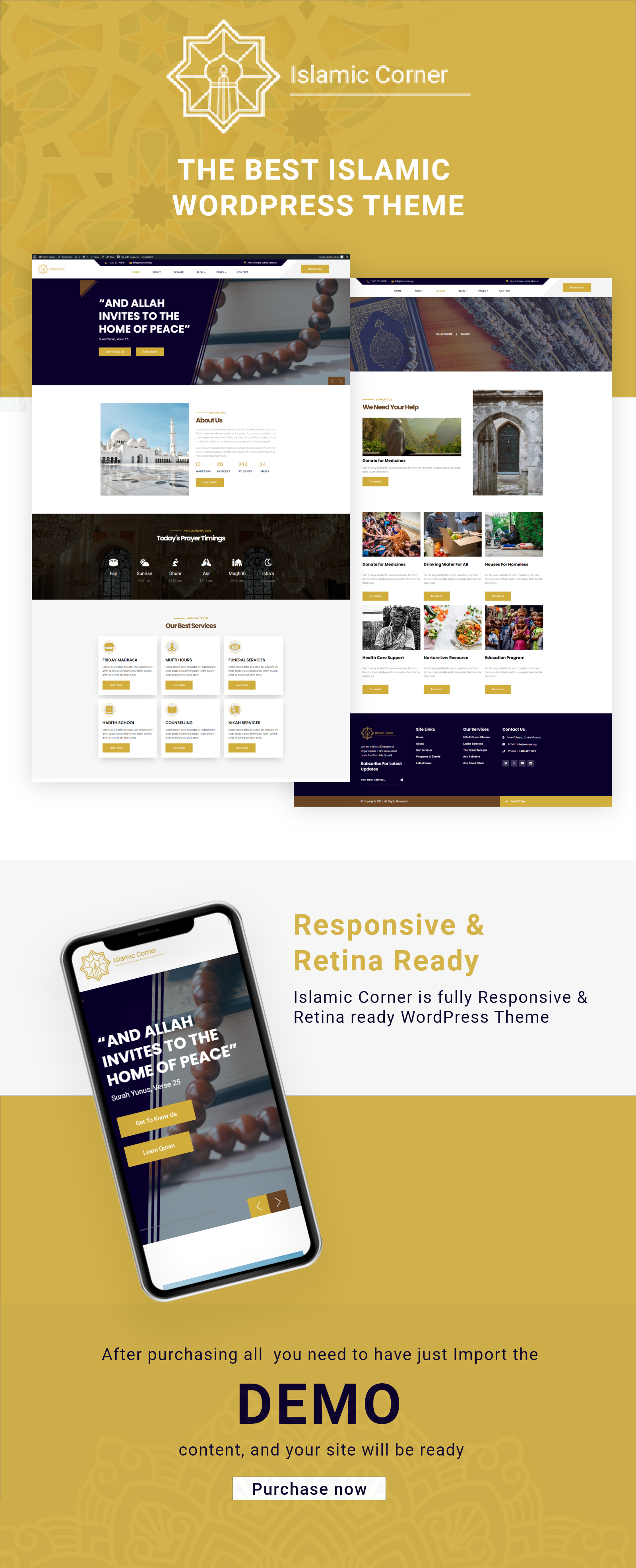 Islamic Corner is a Islamic Responsive WordPress Theme. Islamic Corner is absolute modern, beautiful and elegant Islamic Theme. It has a unique design with amazing features for those who want to build their own Islamic WordPress website. Islamic Corner is highly customizable and you can easily change/update even create all the sections by your own as you like. Islamic Corner built with the required Islamic features that need a Islamic Center. Islamic Corner is 100% responsive for all devices including Desktops, tablets and mobile screens.