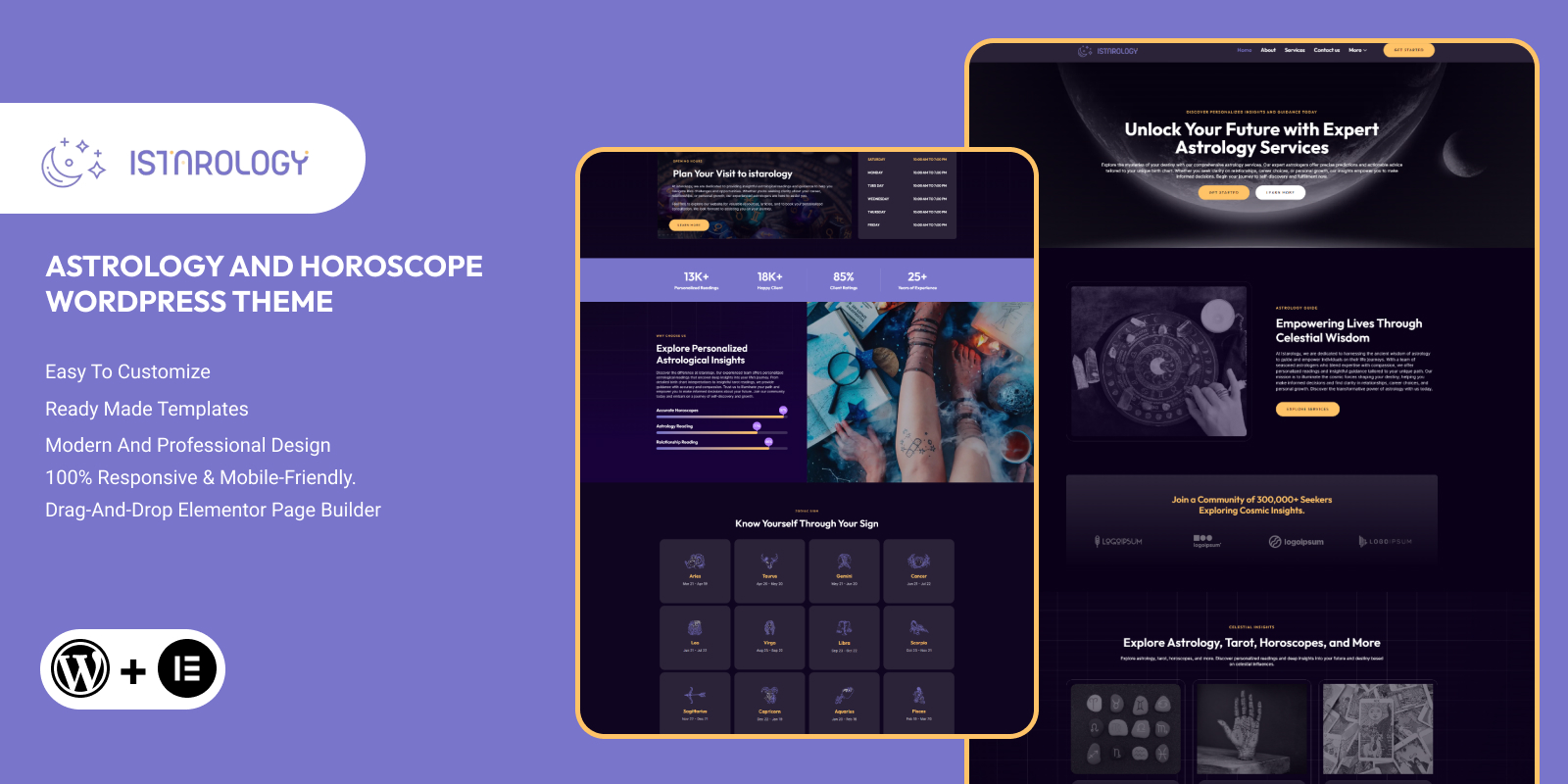 Istarology is a beautifully crafted WordPress theme designed specifically for astrology, horoscope readings, tarot card services, spiritual guidance, and mystic blogs. With a captivating, mystical design and seamless Elementor compatibility, Istarology offers effortless customization and responsive layouts that shine on all devices.