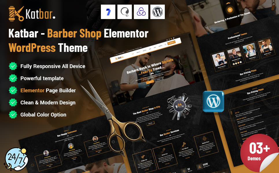 Katbar Barber Elementor WordPress Theme is a professional and stylish theme designed specifically for barbers and hair salons. With its sleek and modern design, this theme will help you create a visually appealing website that showcases your services and attracts more clients. This theme is built on the powerful Elementor page builder, allowing you to easily customize and personalize your website without any coding knowledge. It comes with a range of pre-designed templates and sections that you can use to create a unique and professional-looking website. The Katbar theme also includes features such as appointment booking integration, service pricing tables, and a portfolio gallery to showcase your work. With its responsive design, your website will look great on any device, ensuring a seamless user experience for your clients. Upgrade your barber business with the Katbar Barber Elementor WordPress Theme.