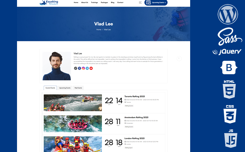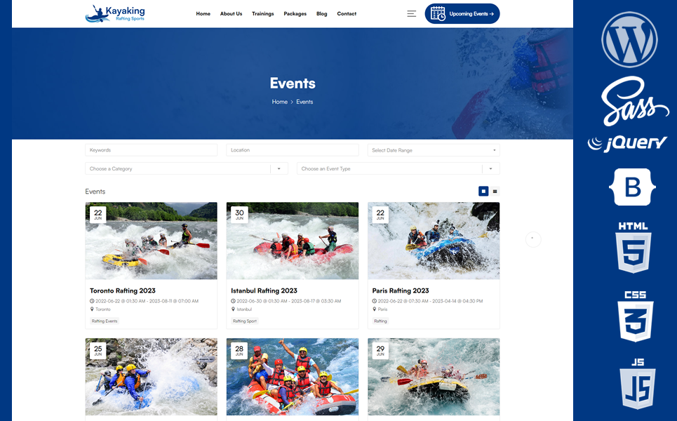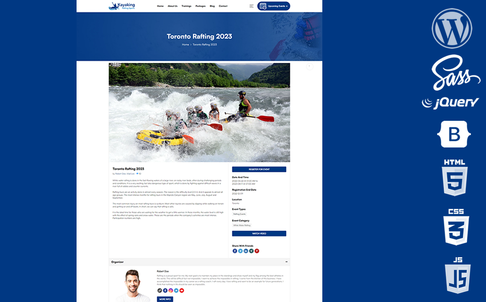 Kayaking WordPress Theme is creative wordpress theme designed for Rafting, Rafting Club, Rafting Trainings, Rafting Lessons, Rafting Events and All Water Sports.