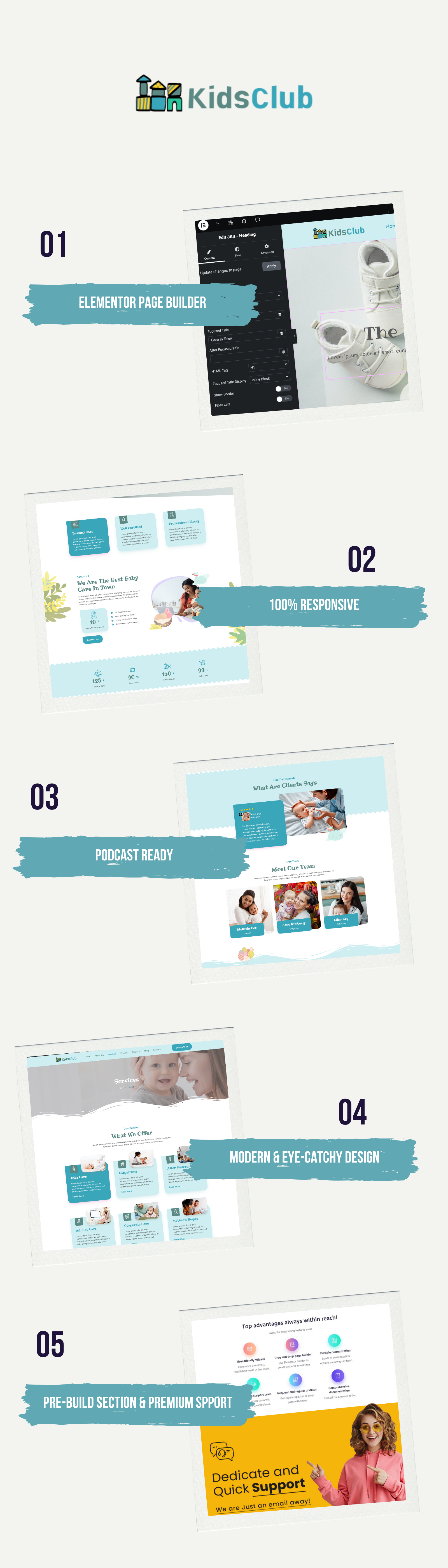 Kids Club is a delightful and color-rich baby care WordPress theme, built on the powerful Elementor platform, designed to cater to the needs of childcare centers, preschools, and nurseries. With its charming and colorful design, it creates a warm and welcoming ambiance that appeals to both parents and children alike. The theme comes equipped with a plethora of customization options, allowing you to effortlessly personalize the layout, colors, and fonts to match your brand and vision. Kids Club offers a user-friendly interface, enabling easy content management and effortless page building, even for those with little to no coding knowledge.