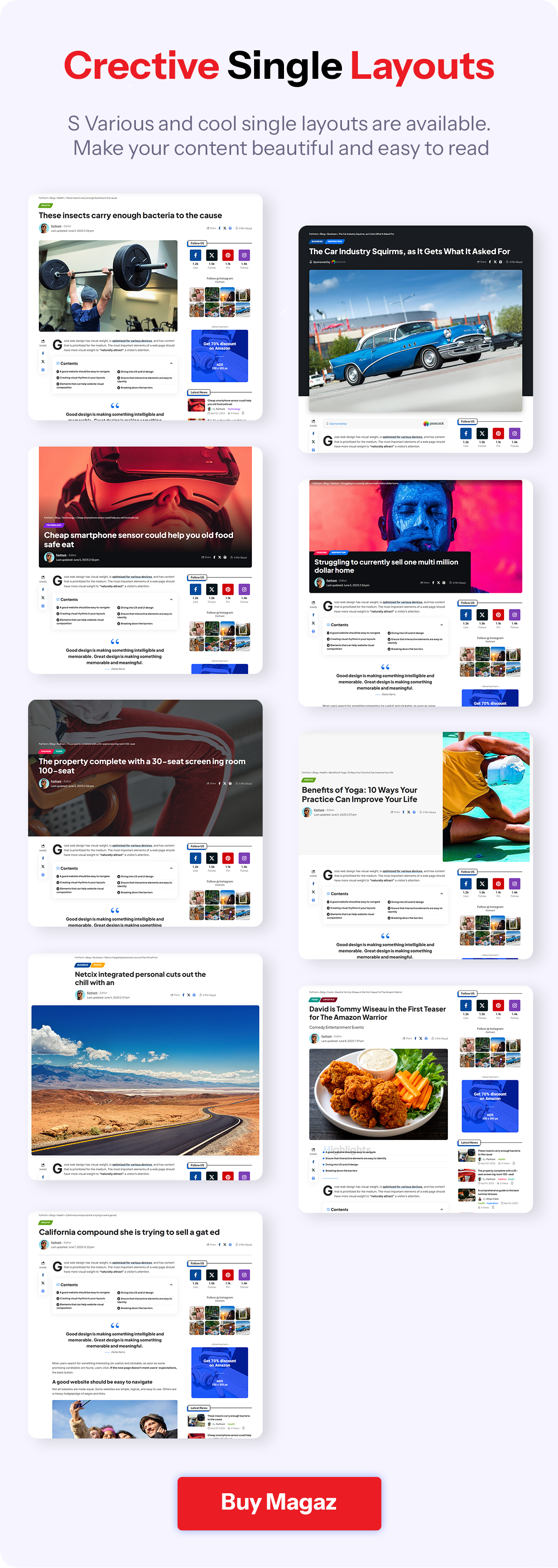 Ideal for a wide range of websites, including news portals, newspapers, magazines, blogs, and niche content like travel, food, fashion, beauty, lifestyle, photography, art, personal stories, and viral media. Also perfect for technology, business, politics, government, military, wildlife, nature, research, affiliate marketing, sports, gaming, video, cryptocurrency, medical, gadgets, phones, hardware, AI, electric vehicles, science, pets, animals, coffee shops, guides, schools, education, freebies, culture, architecture, recipes, and health.