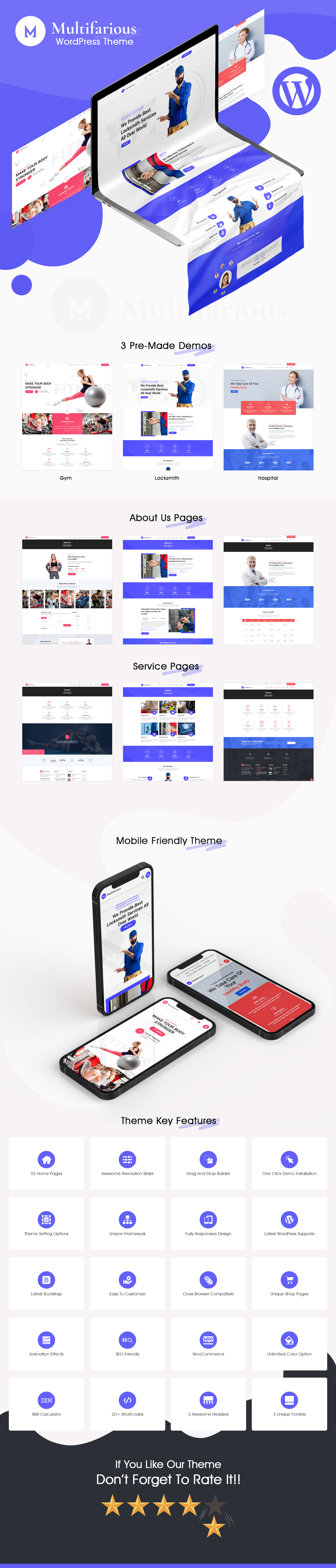 Welcome to Multifarious - a powerful WordPress theme packed with everything you will ever need to create a truly amazing website and do it fast! Multifarious is specially designed for gym-related businesses like dance, Zumba, aerobics, sports club, personal trainer, bodybuilding businesses, etc. Locksmith-related businesses like Residential Locksmith, Commercial Locksmith, Vehicles Locksmith, Unlock Service, Business Locksmith, Key Duplication, Key Cutting, etc. Medicine services like hospitals, clinics, laboratories, pharmacies, healthcare centers, nutritionists, Medical stores, pharmaceuticals, etc.