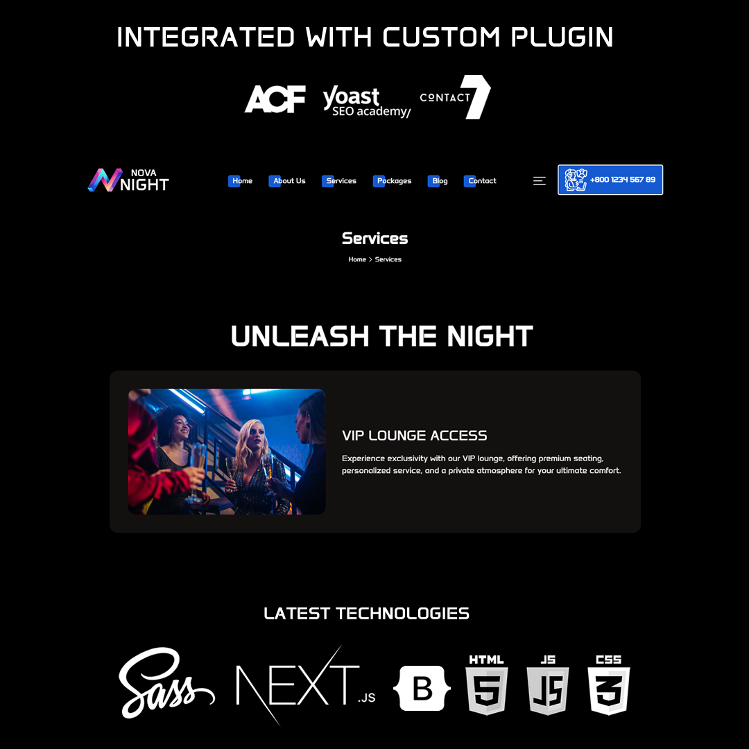 NovaNight is not just about stunning design; it’s also about performance and functionality. The theme is built with the latest web technologies, including Bootstrap, Next.js, and SASS, ensuring your site is fast, responsive, and easy to maintain. The ACF integration allows for endless customization, giving you the flexibility to create a site that perfectly matches your brand’s identity.