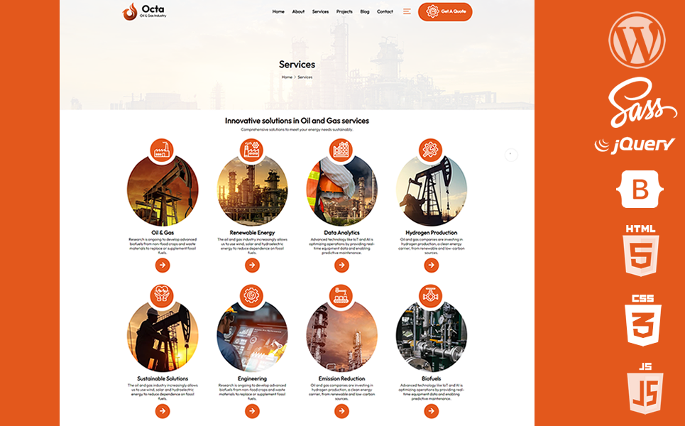 The services section is where you can truly highlight your specialization in the oil and gas industry. Octa features a services area with icons specifically designed for this sector, allowing you to showcase your range of offerings in a visually appealing and informative manner.