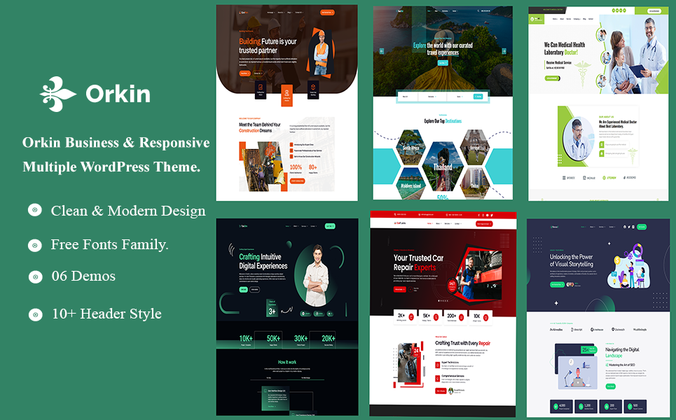 Orkin Business & Multipurpose Responsive WordPress Theme. Discover the power of versatility with Orkin – the ultimate Business and Multipurpose Responsive WordPress Theme. When you purchase Orkin, you’re not just getting one theme – you gain access to six professionally designed, category-specific themes tailored to fit a variety of industries and needs. Whether you're building a site for a startup, portfolio, corporate brand, or creative agency, Arkin gives you the flexibility to switch themes at any time. Get all the tools you need in one powerful package.