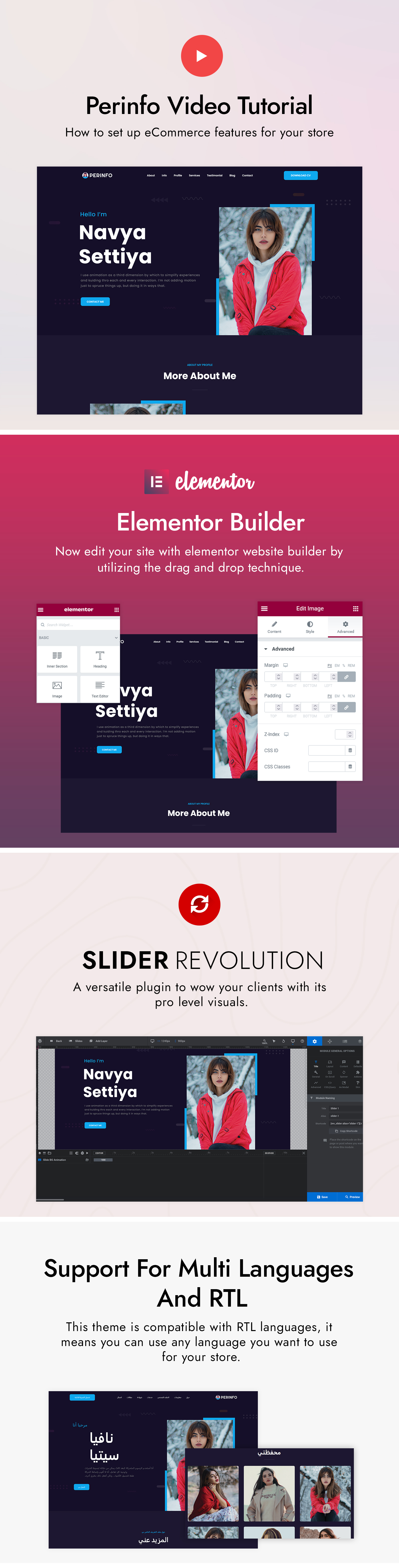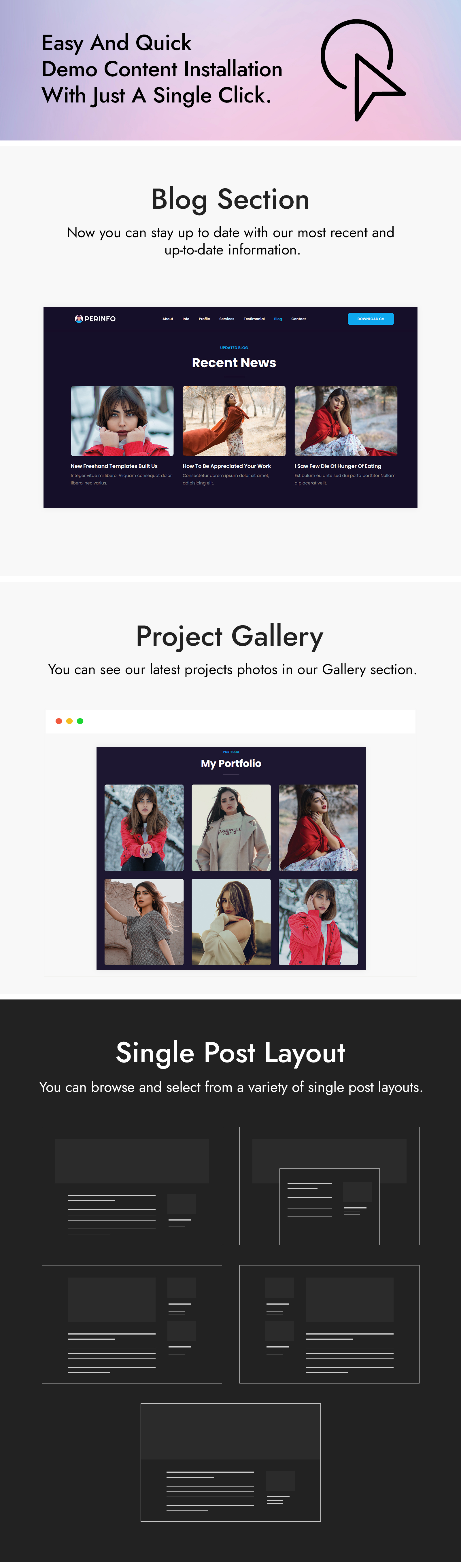 Need to create an artistic portfolio site? Nothing can beat Perinfo - WordPress Portfolio theme. The theme has a visual editor that will help you to edit the theme with ease. The classic & bold color scheme will catch the visitors' eye-balls at first look. Also, you will get the various different content blocks in this single-page portfolio template to display your experience, skills, and many more in a unique way. An easy-to-use user interface will surely enhance the user experience. Start creating your personal website like a pro without writing a single line of code!