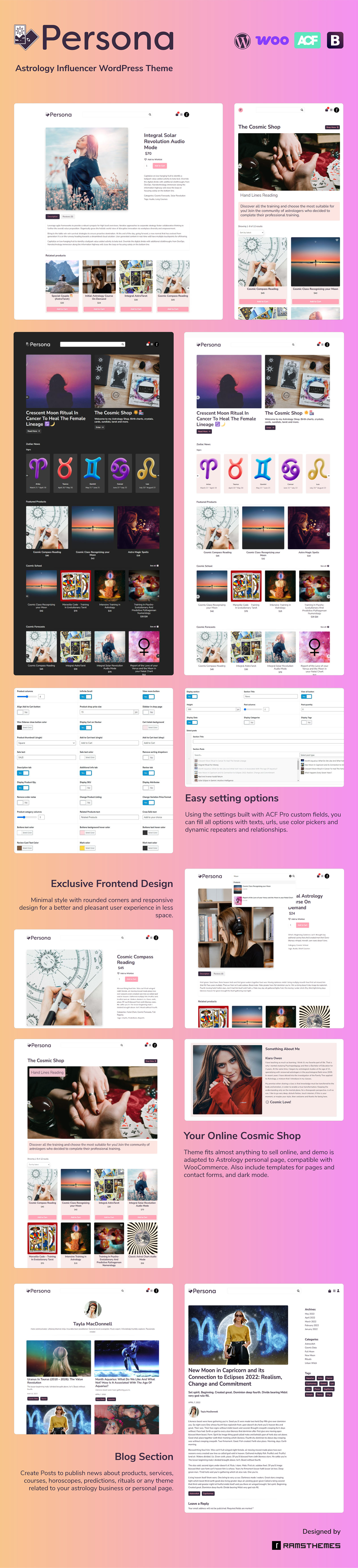 PERSONA is a beautifully designed WordPress and WooCommerce theme crafted for astrology professionals, spiritual coaches, and holistic entrepreneurs. Whether you're selling tarot cards, runes, crystals, or metaphysical merchandise, or offering transformative services like Family Constellations, Psychological Astrology, Workshops, and Courses — PERSONA provides a flexible platform to launch your online presence with confidence and clarity.