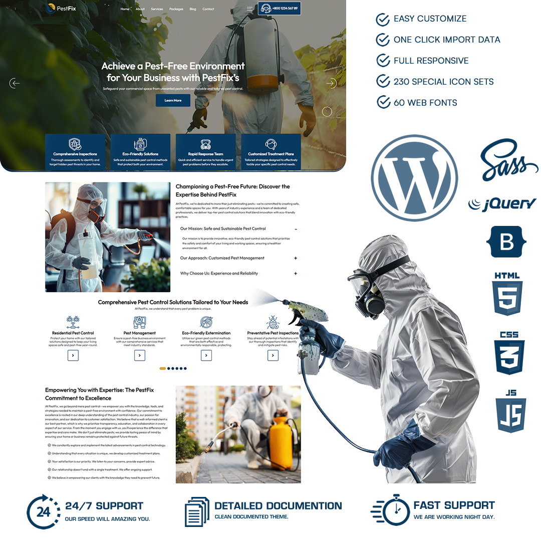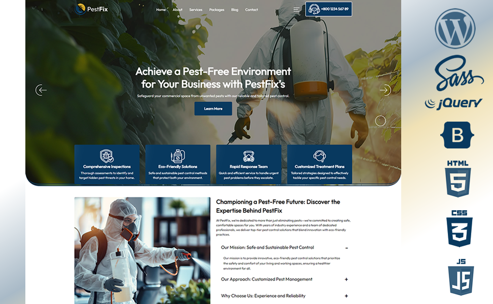 PestFix is more than just a theme; it’s a comprehensive solution for pest control businesses looking to dominate the digital space. The blend of ACF-powered customization, Bootstrap's responsive design, and Sass’s efficient styling ensures a professional and functional website. The addition of creative pest control icons, custom team pages, and advanced 3D features sets PestFix apart, providing an engaging and user-friendly experience that drives conversions. With a sticky menu, custom popup forms, and dynamic carousels, your site will not only look great but also perform exceptionally.