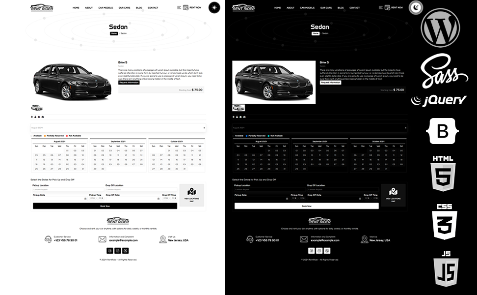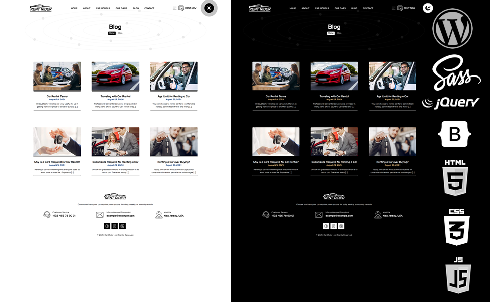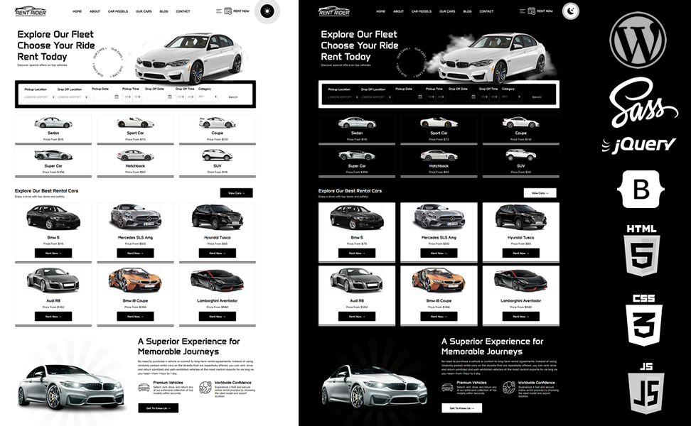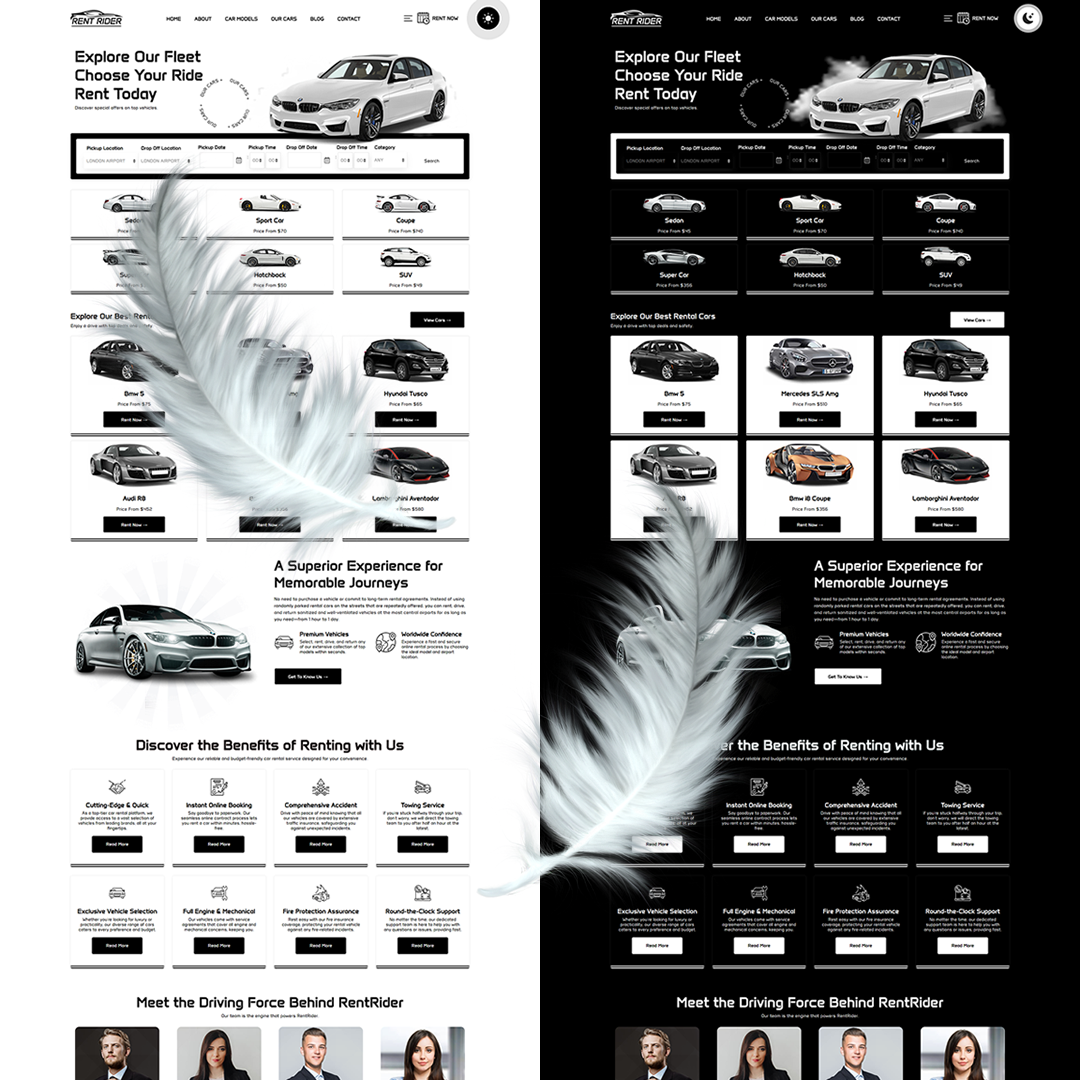 Introducing RentRider, a cutting-edge WordPress theme designed for car rental service providers who seek to combine functionality with modern aesthetics. This theme offers both light and dark modes, effortlessly switchable with a simple toggle, allowing users to customize their browsing experience to their preference, day or night.