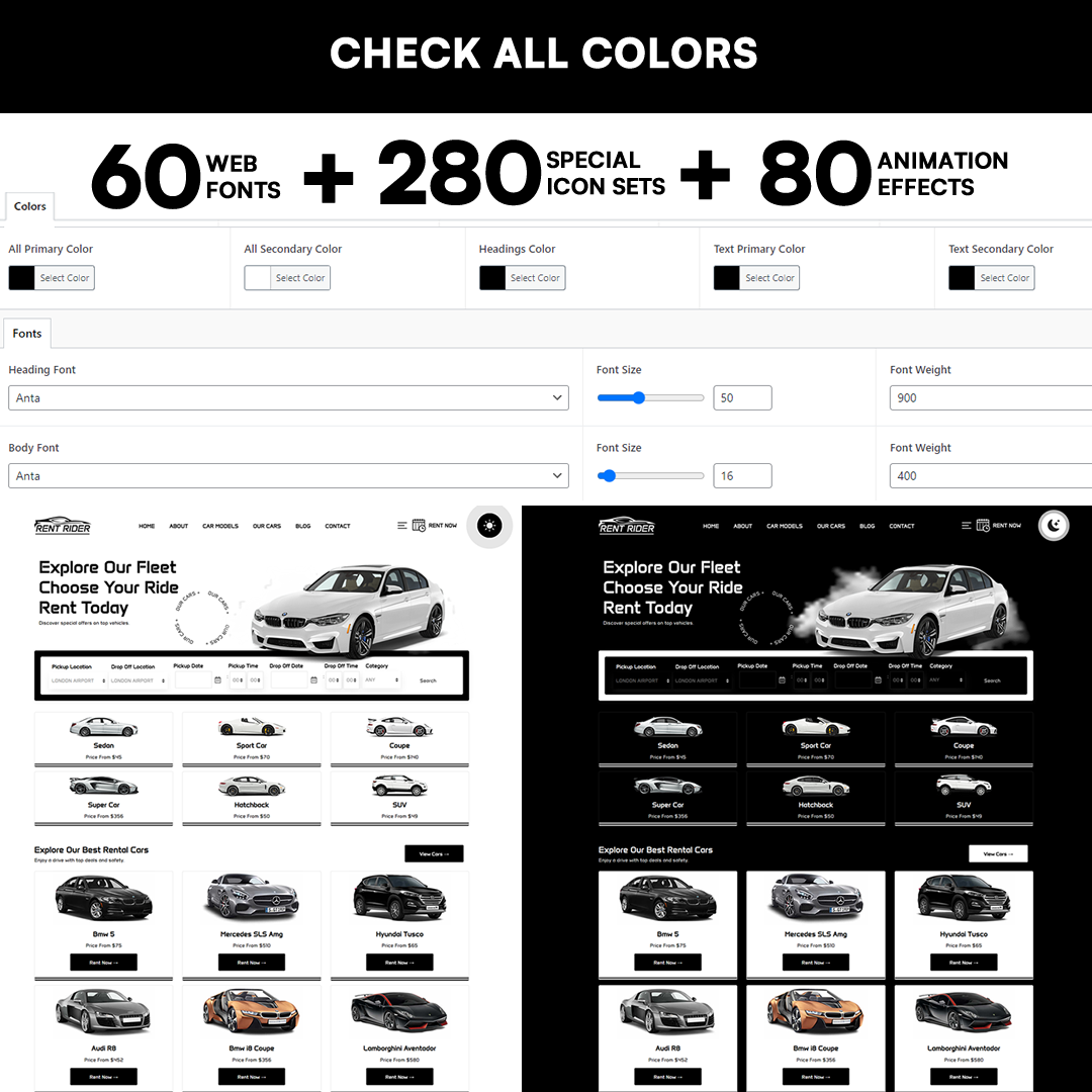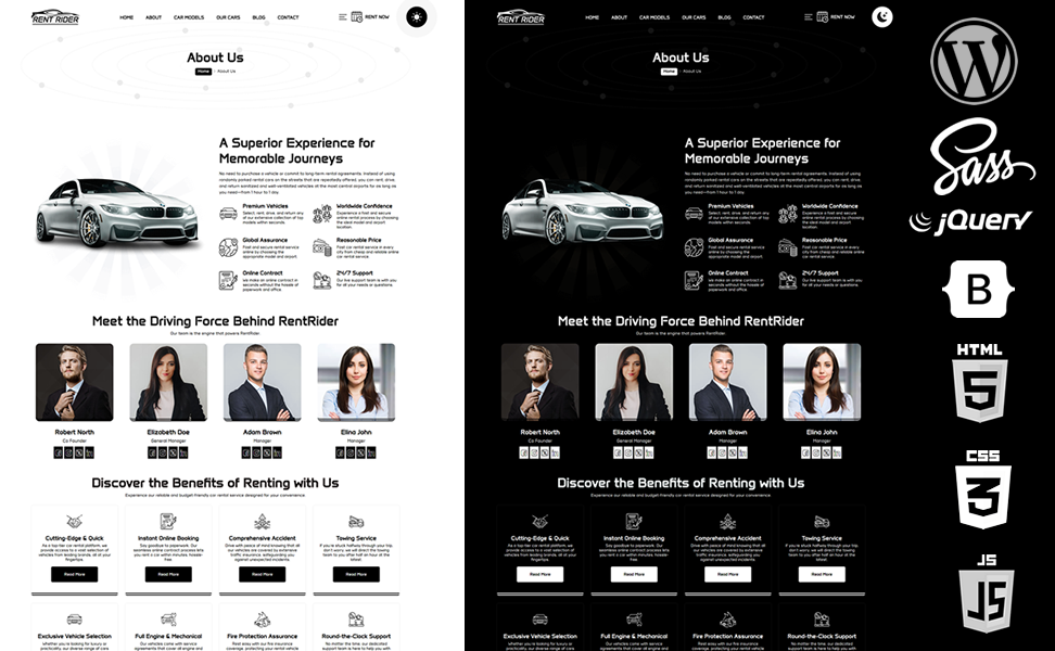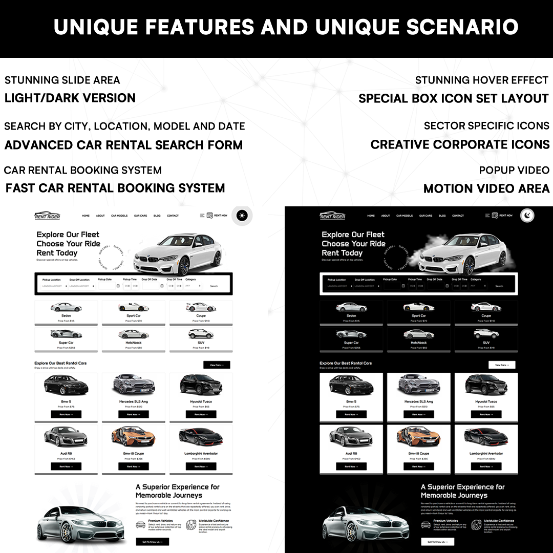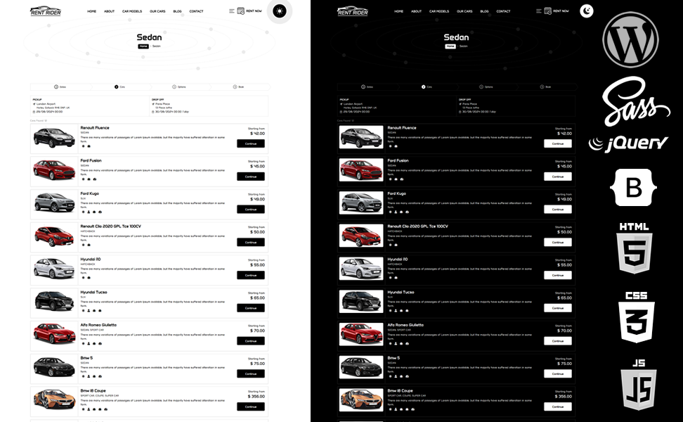 Introducing RentRider, a cutting-edge WordPress theme designed for car rental service providers who seek to combine functionality with modern aesthetics. This theme offers both light and dark modes, effortlessly switchable with a simple toggle, allowing users to customize their browsing experience to their preference, day or night.