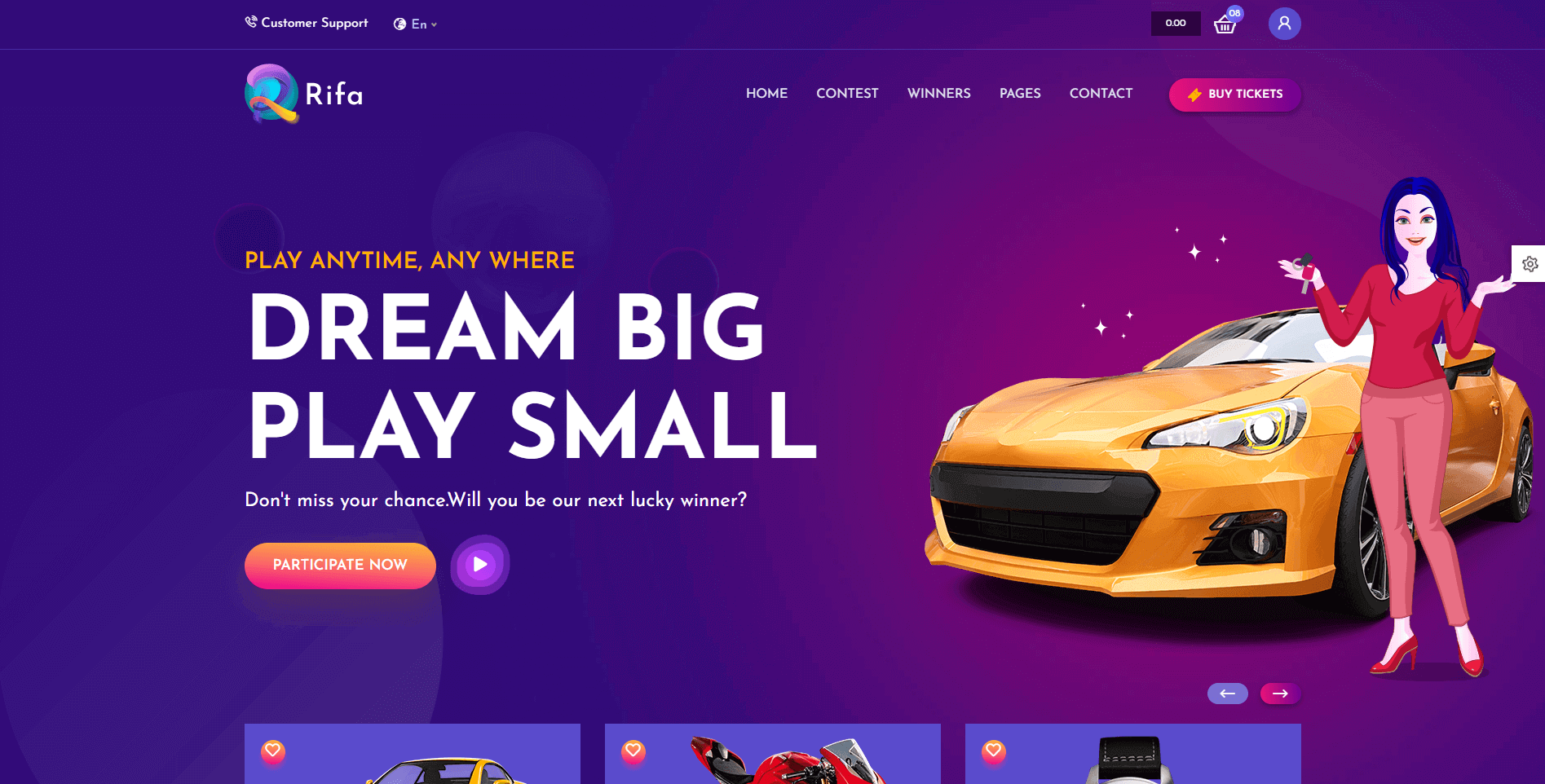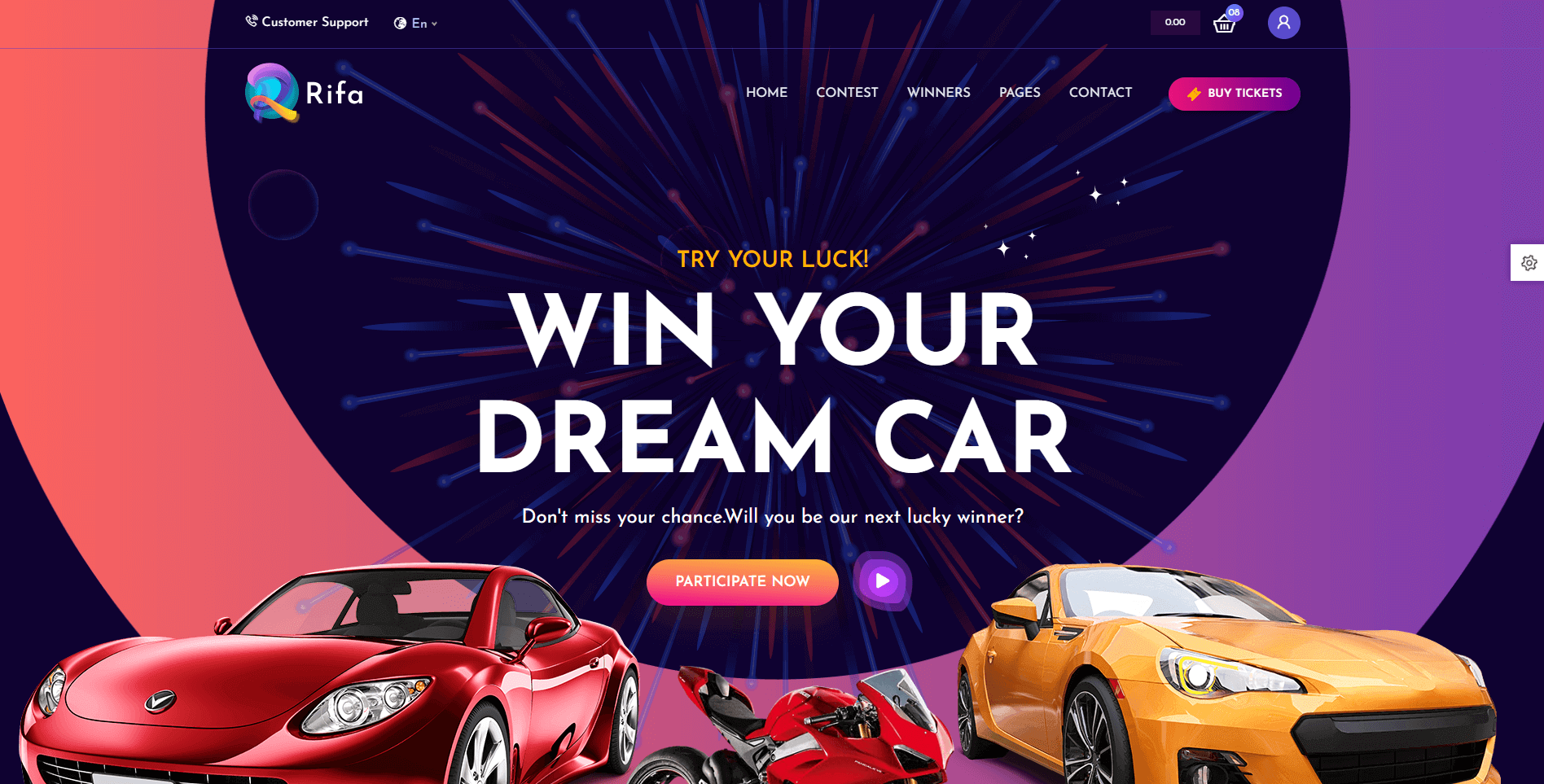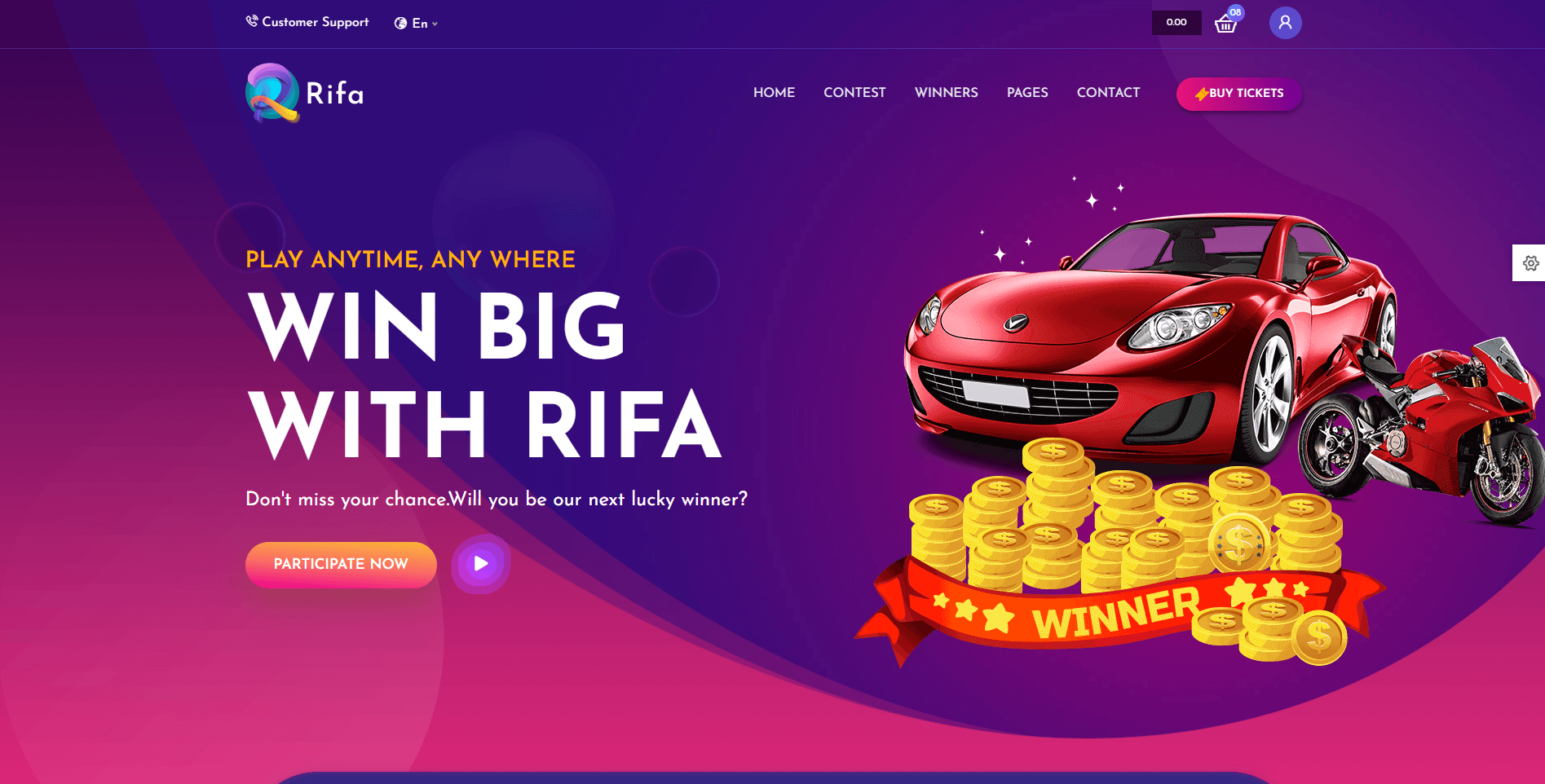 Rifa is a vibrant, fully responsive WordPress theme purpose-built for online lottery, raffles, lucky draws, and giveaway websites. Whether you're launching a one-time prize draw or running a full-scale raffle ticket selling business, Rifa is the perfect platform to help you promote and manage lottery campaigns effortlessly.