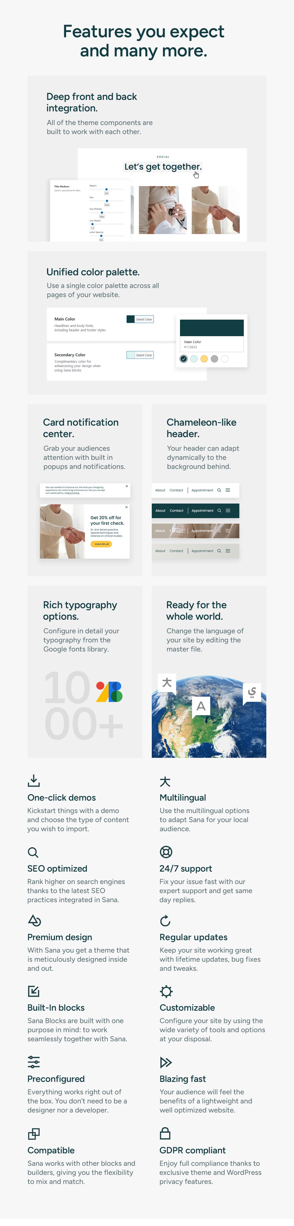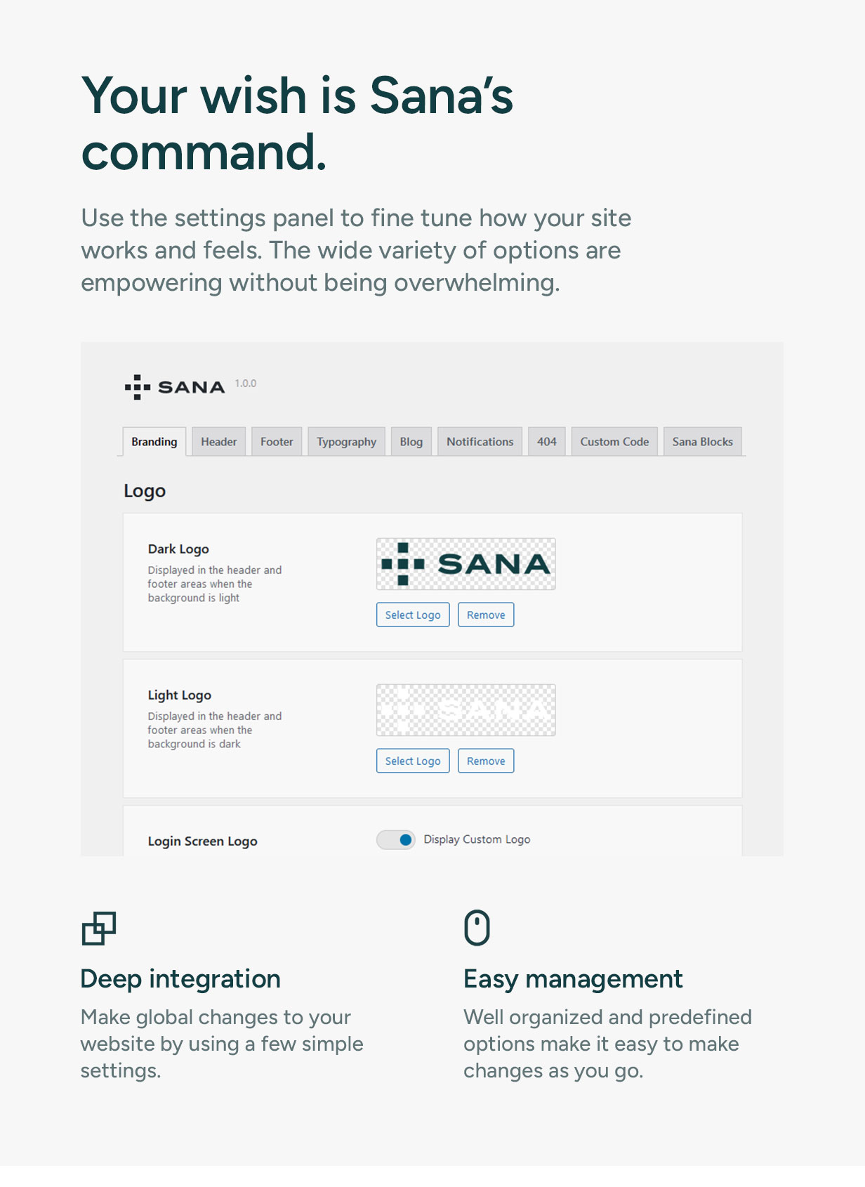 Your wish is Sana’s command. Use the settings panel to fine tune how your site works and feels. Wide variety of options are empowering without being overwhelming.