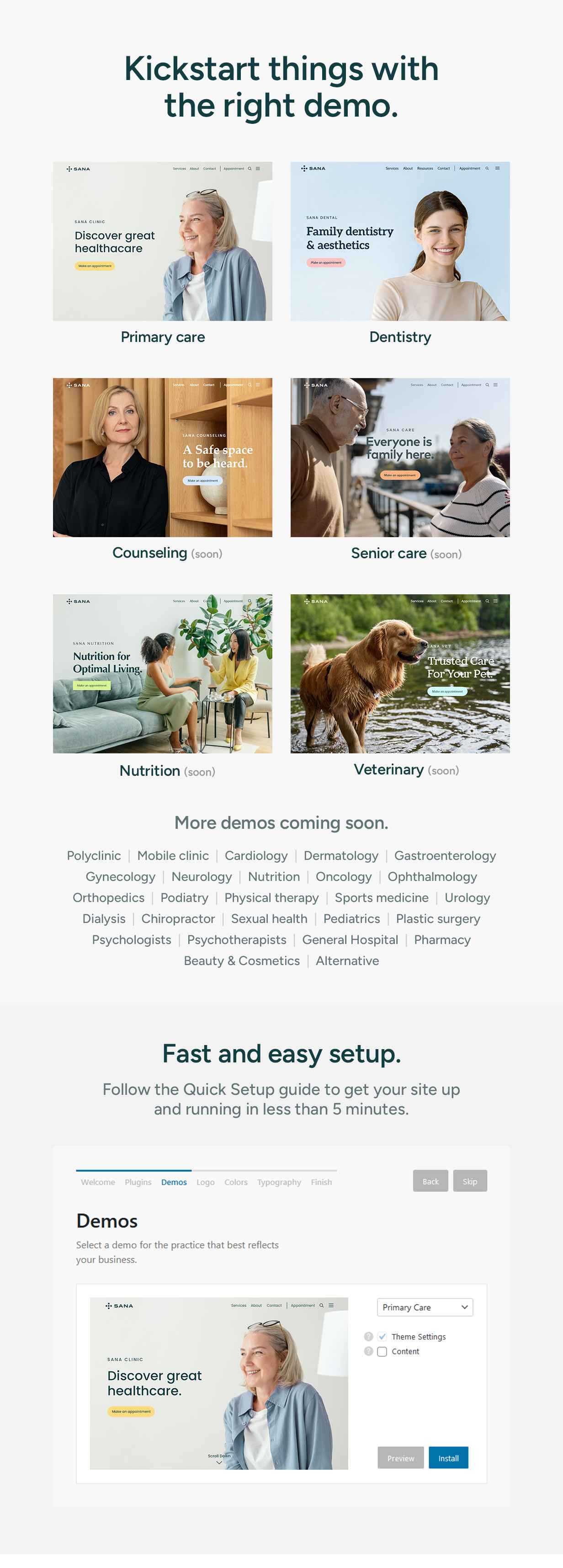 Bring your medical practice to the next level. By being preconfigured and optimized straight out of the box, Sana helps you set things up quickly and easily. The included custom Gutenberg blocks allow you to focus on your content, without the need for designing and coding. Use Sana to build and manage a professional website for your healthcare business.