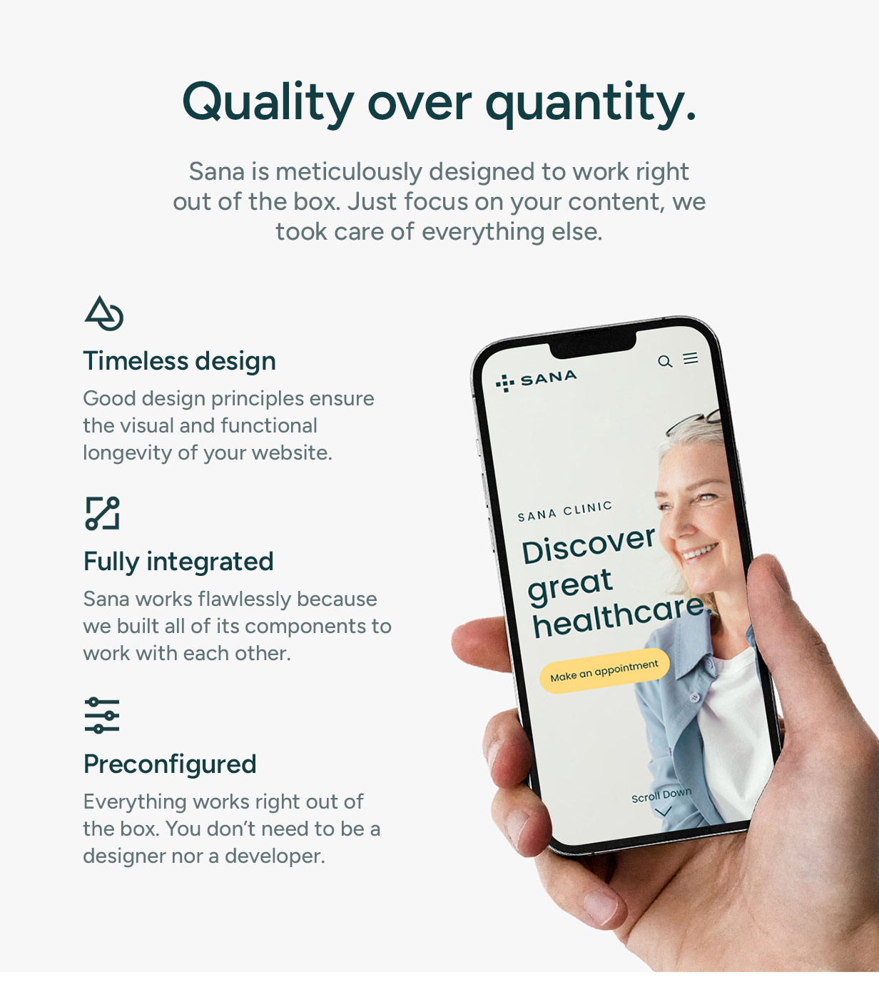 Quality over quantity. Sana is meticulously designed to work right out of the box. Just focus on your content, we took care of everything else.