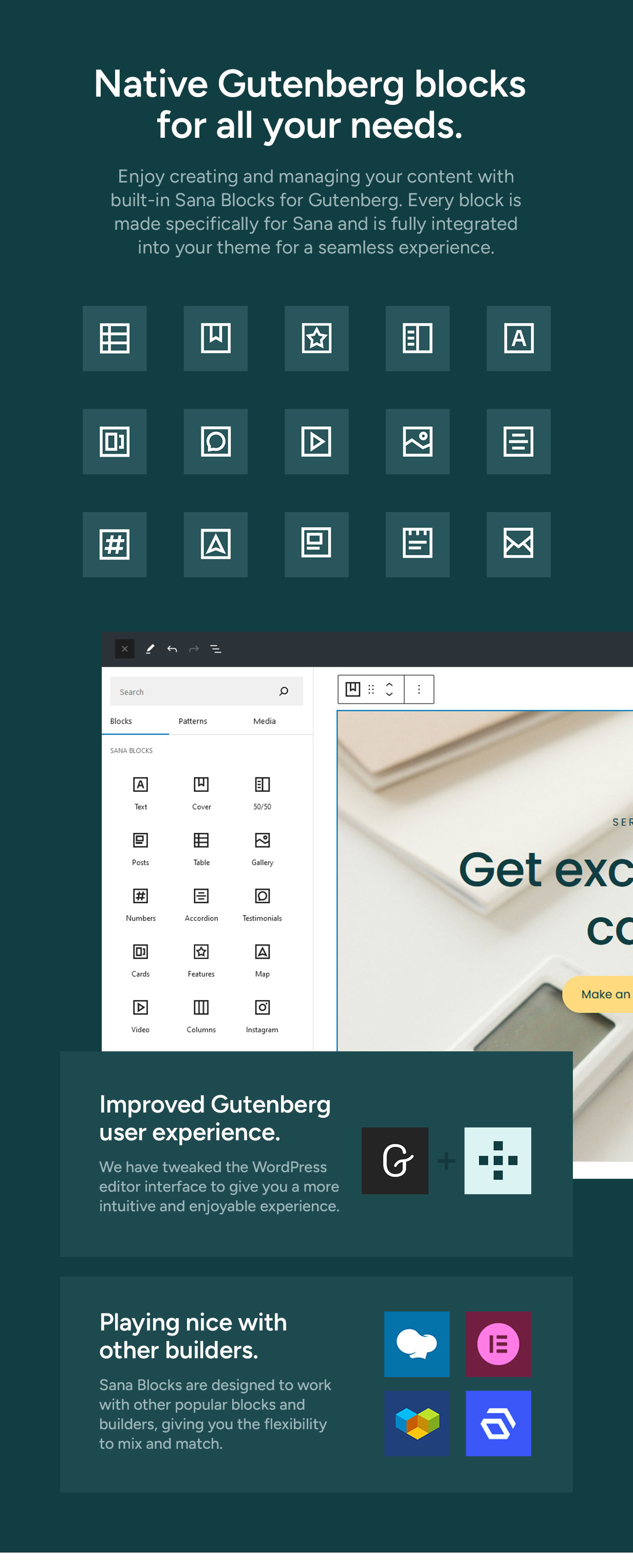 - Playing nice with other builders - Sana Blocks are made to work with other popular blocks and builders, so you have the flexibility with mixing and matching.