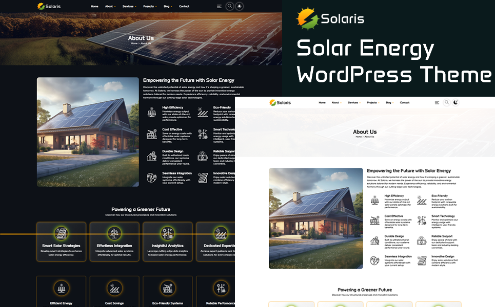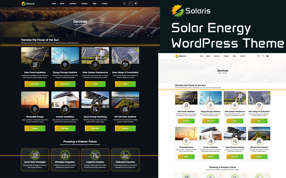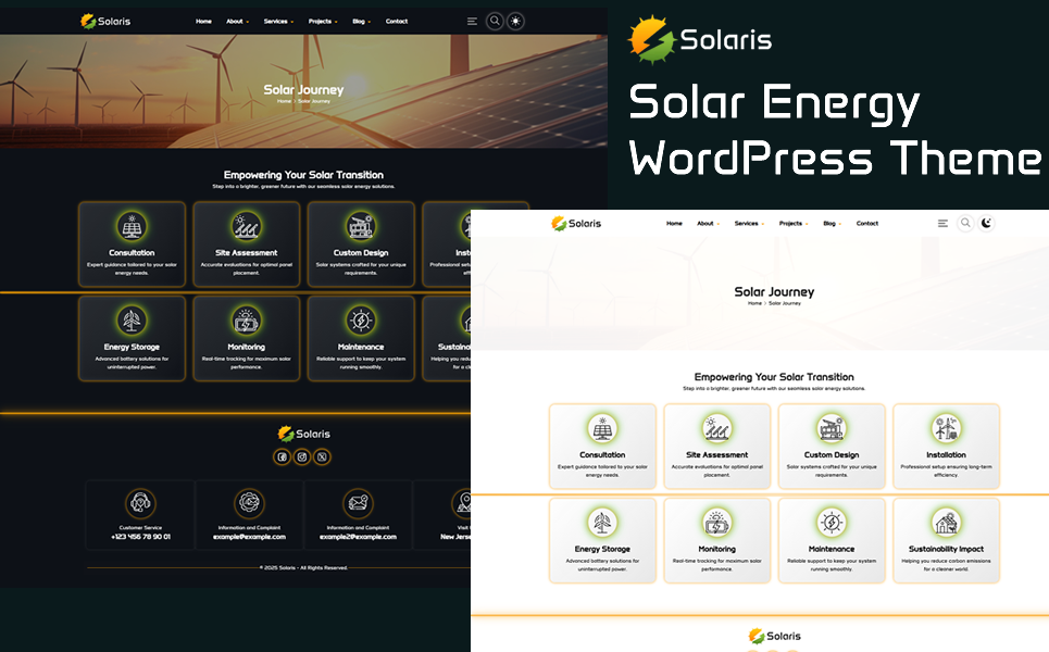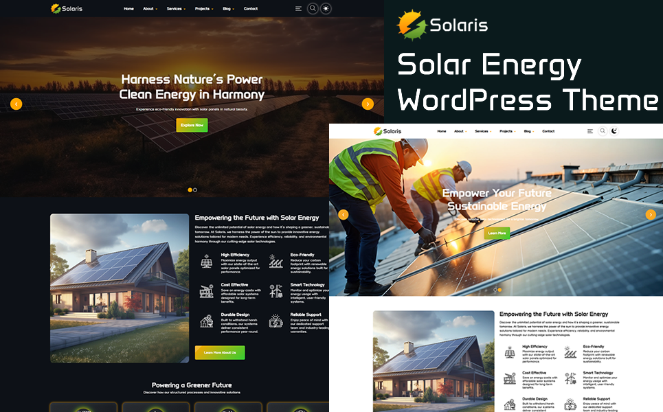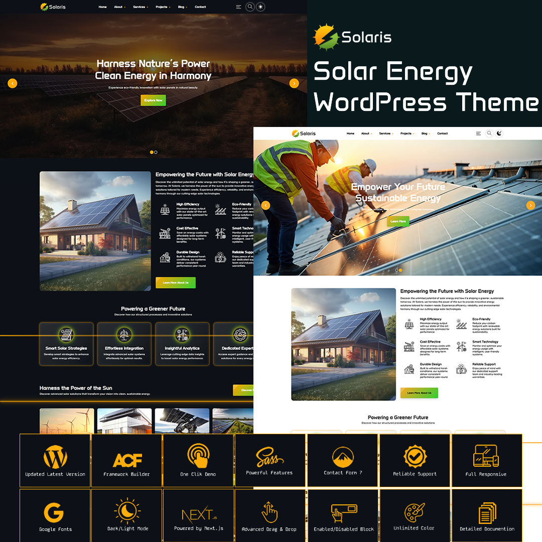 Solaris is not just another WordPress theme; it is a groundbreaking solution for businesses, individuals, and organizations dedicated to renewable energy, solar power, and sustainable living. Designed to meet the growing demand for eco-friendly solutions, Solaris combines sleek aesthetics with high functionality to help you showcase your mission and projects effectively. Whether you're running a solar panel installation service, a sustainability blog, or an eco-business website, Solaris empowers you to create an impactful online presence effortlessly.