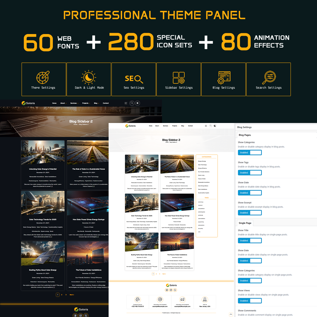 Solaris includes an intuitive theme settings panel that provides total control over every aspect of your website's design and functionality. Here's what you can do: