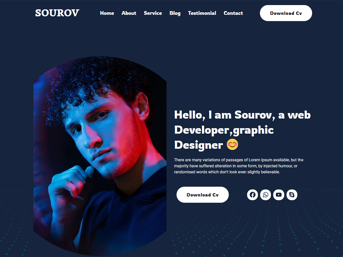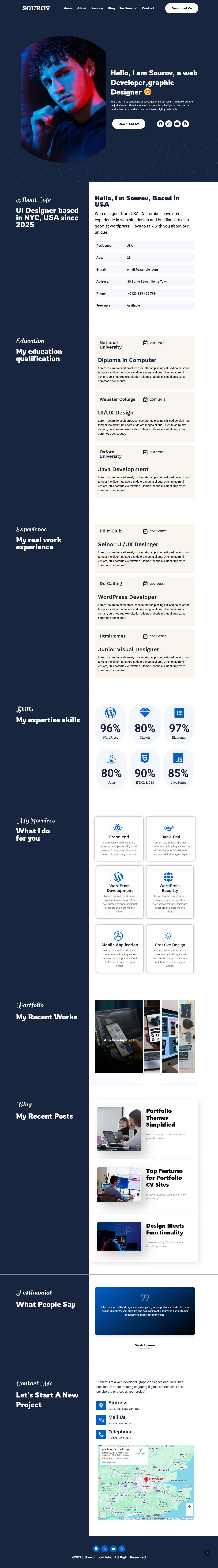 Sourov's design is minimalistic yet stylish, ensuring your content is the center of attention. The one-page layout is perfect for professionals who want to present their skills, experiences, and projects in a concise and impactful manner. Whether you're a freelancer, designer, developer, or corporate professional, this theme adapts effortlessly to any industry.