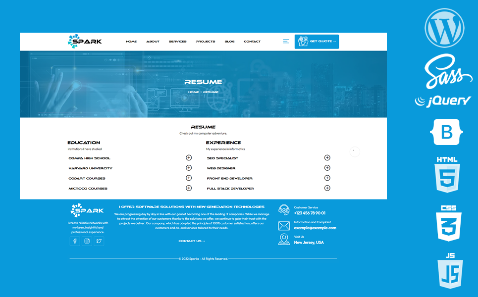 Sparka wordpress theme offers a stunning CV layout. Thus, it leads you to show your education, business life, services, projects, advantages, customers and all your work history from a modern point of view.