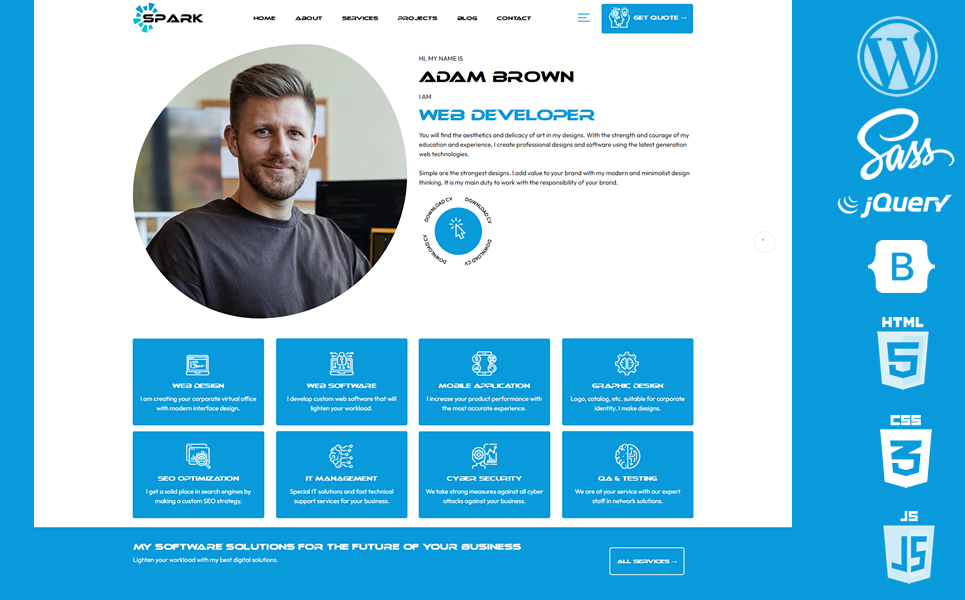 Sparka WordPress Theme is a digital wordpress theme with advanced features designed on Personal, Freelancer, Personal Portfolio, Web Designer, Web Developer, CV, Resume, Graphics and Technology.