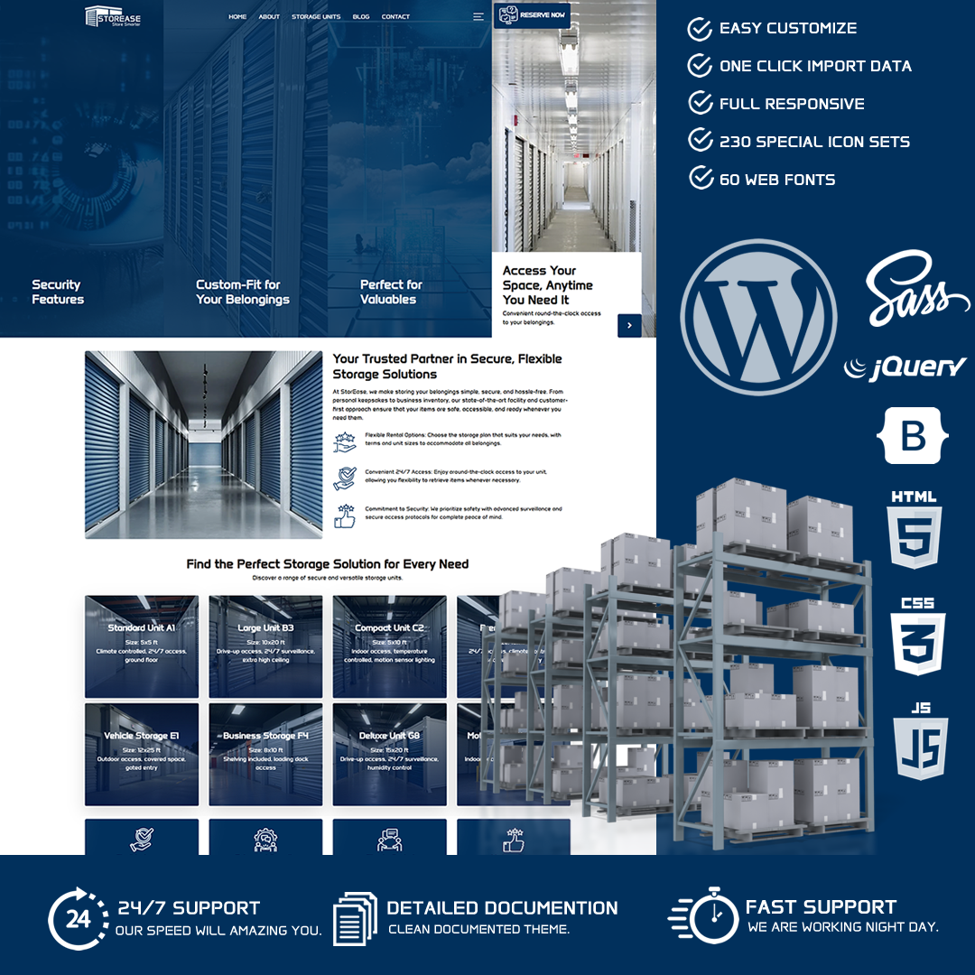 StorEase is a versatile, user-friendly WordPress theme specially designed for self-storage and facility management businesses aiming to establish a professional, organized, and inviting online presence. With a streamlined interface and impressive design, StorEase offers a unique blend of powerful features and visually engaging elements. Every aspect of StorEase is crafted to create a seamless, secure, and appealing experience for clients looking for reliable storage solutions.