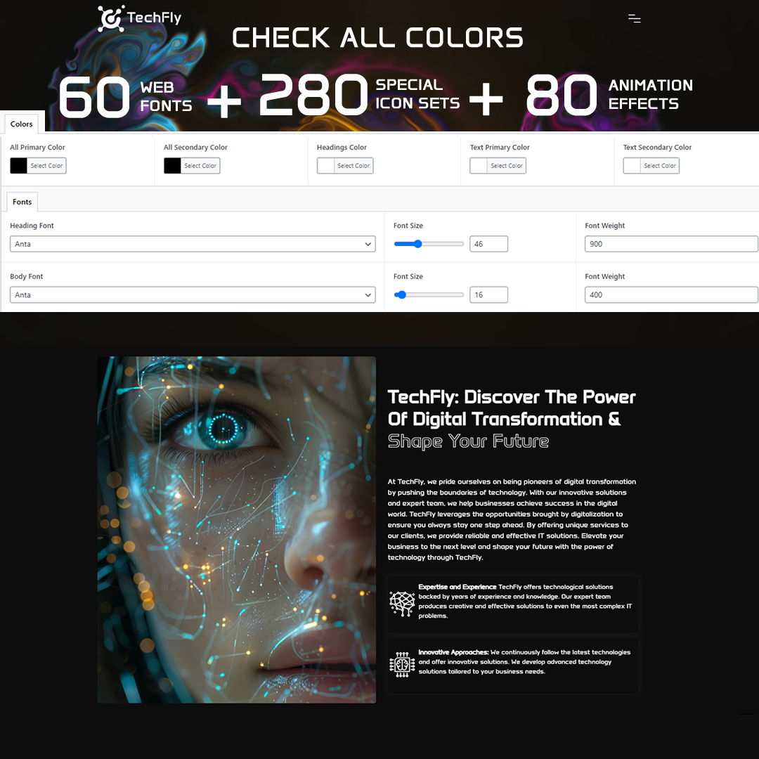 Customizable and User-Friendly TechFly is highly customizable, allowing you to tailor every aspect of your site to match your brand’s unique identity. From colors and fonts to layout and content, you have complete control over the look and feel of your site. Additionally, the user-friendly interface ensures that even those with minimal technical expertise can easily manage and update their site.
