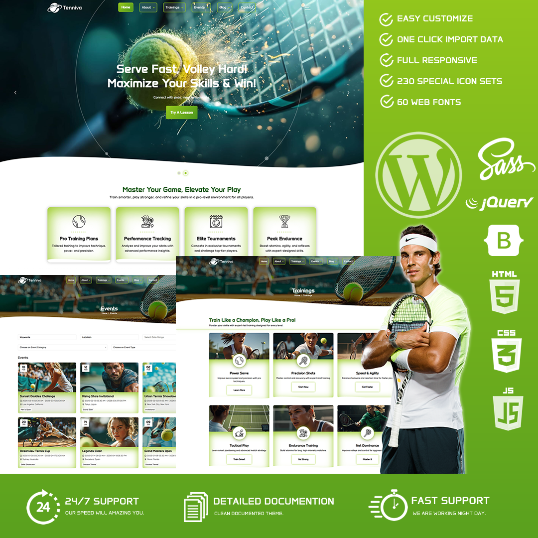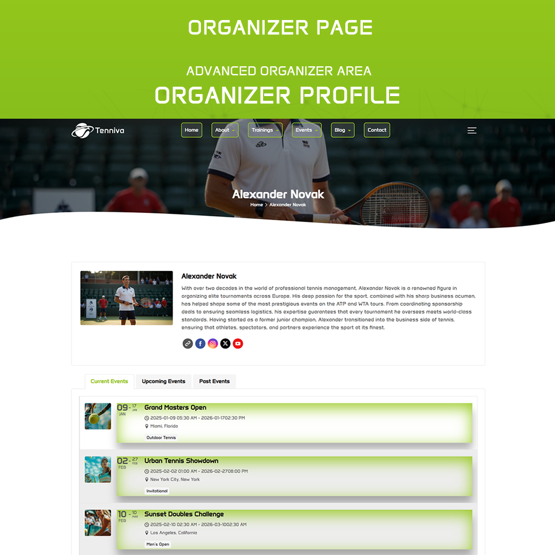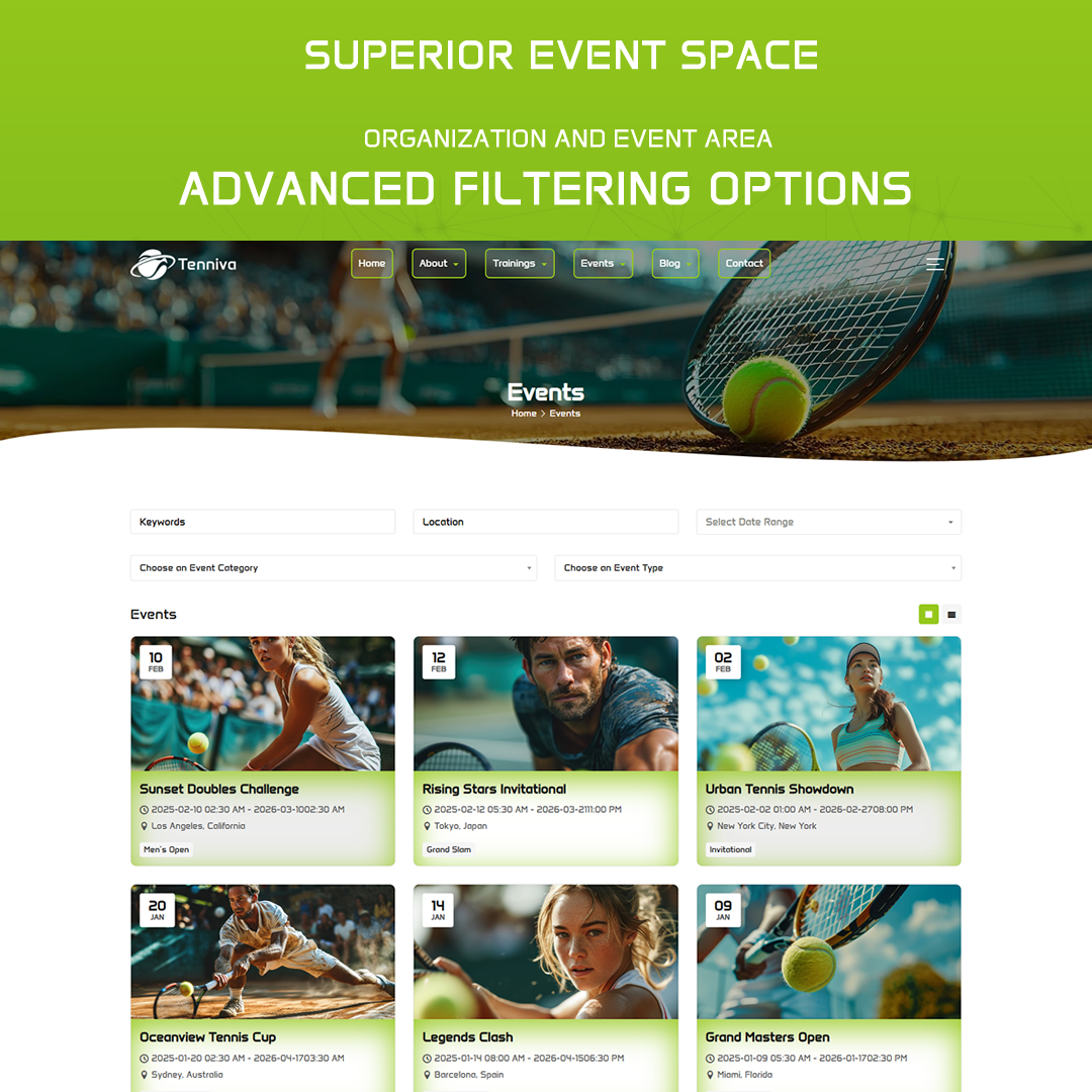 - Robust Event System Manage all tennis events with ease. Whether it’s local meetups or large-scale tournaments, the theme’s advanced event settings let you schedule, categorize, and display events professionally.