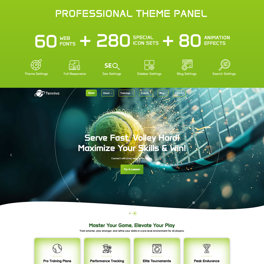 Tenniva is a comprehensive, modern, and feature-rich WordPress theme built to transform your tennis club’s online presence. Designed with captivating visuals and a robust framework, Tenniva empowers you to showcase tournaments, training sessions, and club events in a dynamic, user-friendly interface. Below are the key highlights that make Tenniva the definitive solution for tennis clubs, event organizers, and sports enthusiasts:
