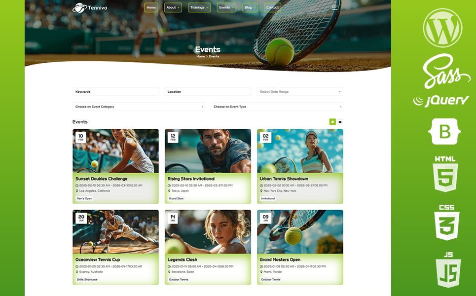 - Robust Event System Manage all tennis events with ease. Whether it’s local meetups or large-scale tournaments, the theme’s advanced event settings let you schedule, categorize, and display events professionally.