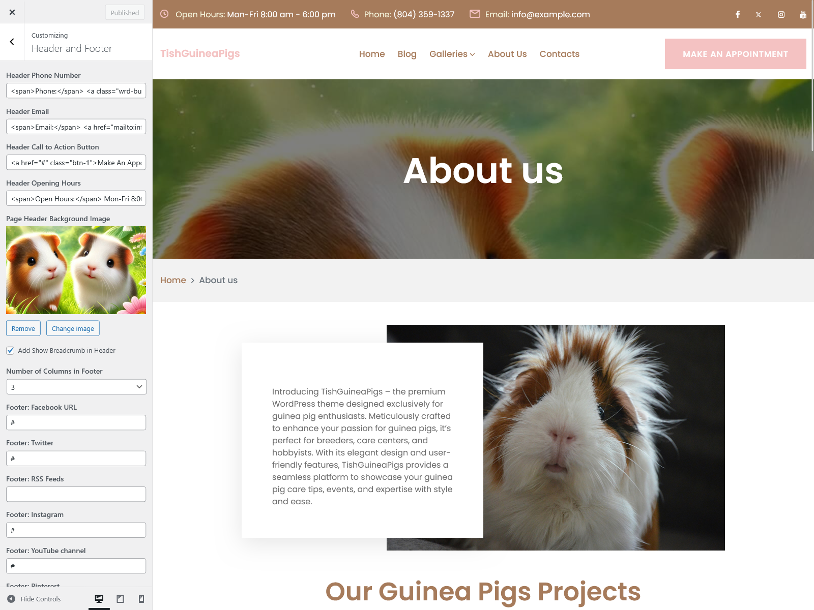 Getting started with TishGuineaPigs is a breeze, thanks to the One Click Demo Import feature. This allows you to quickly import a pre-designed demo site, complete with all the necessary pages and content. Whether you're a beginner or an experienced web designer, this feature saves you time and effort, enabling you to focus on what matters most – your guinea pigs.