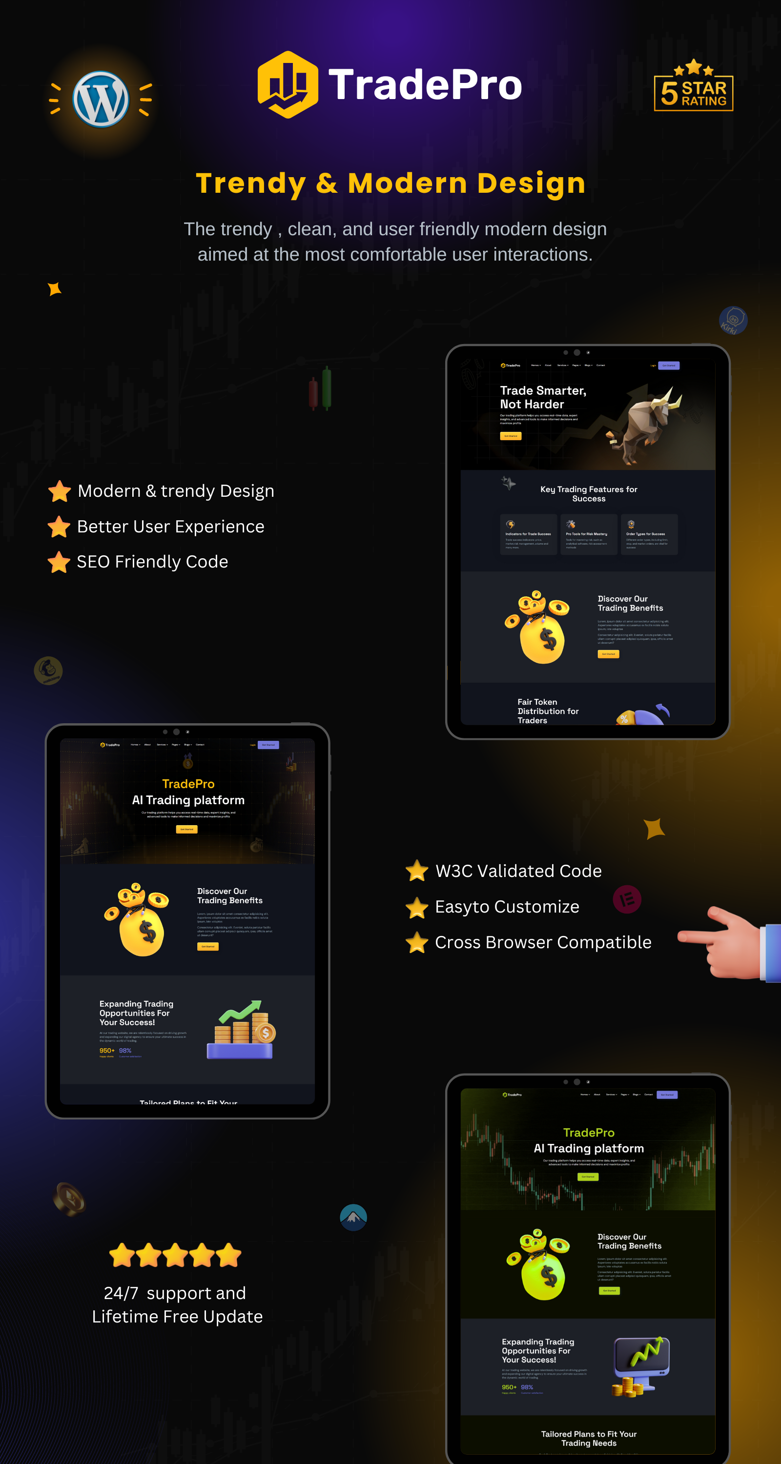 Introducing TradePro WordPress Theme, the ultimate trading platform solution for professionals in forex trading, cryptocurrency trading, stock trading, ETF trading, and CFD trading. Designed with brokers and traders in mind, TradePro combines cutting-edge technology with ease of use, allowing you to create a fully responsive and SEO-optimized website that draws in traders from every corner of the world. Powered by the drag-and-drop Elementor page builder, this theme is perfect for crafting visually appealing trading platforms for day trading, commodities trading, and financial markets.