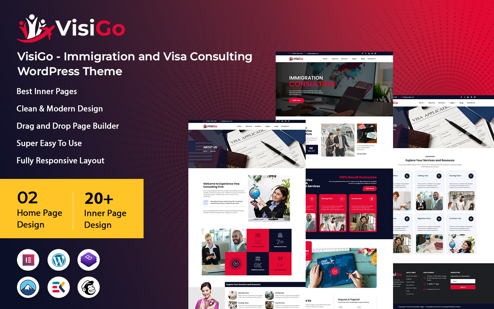 Visigo is a premium WordPress theme for immigration and visa consulting businesses. If you are running such a business and are looking for a WordPress theme then Visigo is the one for you. You can create a unique and professional website with its customizable features. It ensures your site looks great on all devices with responsive design. Your business will benefit from a user-friendly interface and modern aesthetics. Customers will appreciate intuitive navigation. Visigo helps you stand out in the competitive market. Visigo will elevate your online presence and attract more clients to your business.