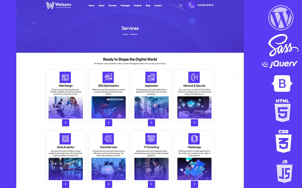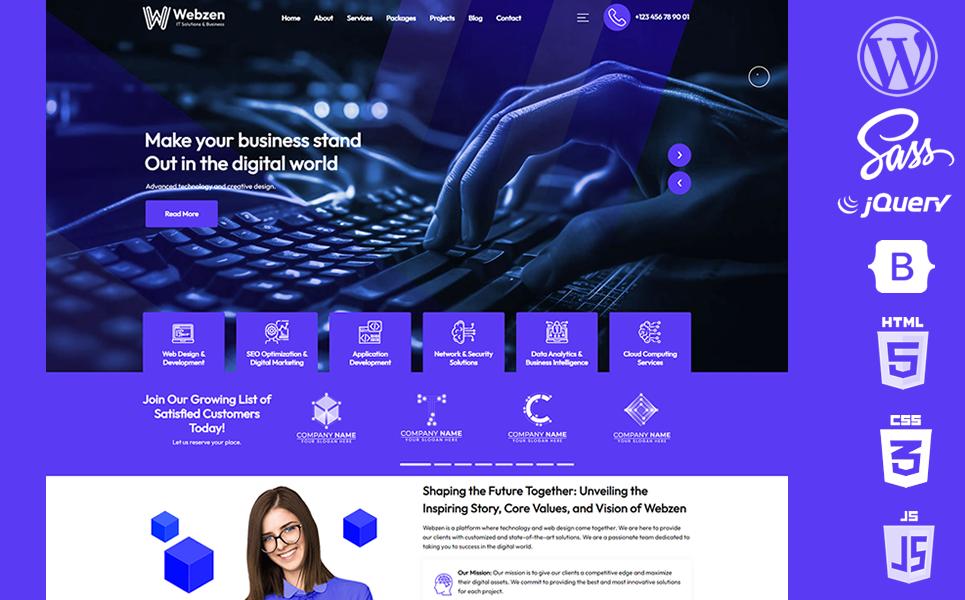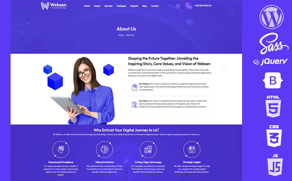 Prepare to embark on a digital journey with the Webzen WordPress theme. Webzen IT Solutions proudly presents this creative WordPress theme tailored specifically for Web Design, Web Development, and Technology companies. Designed in captivating shades of blue, this theme allows you to effortlessly customize all colors and tones with a single click in the theme settings.