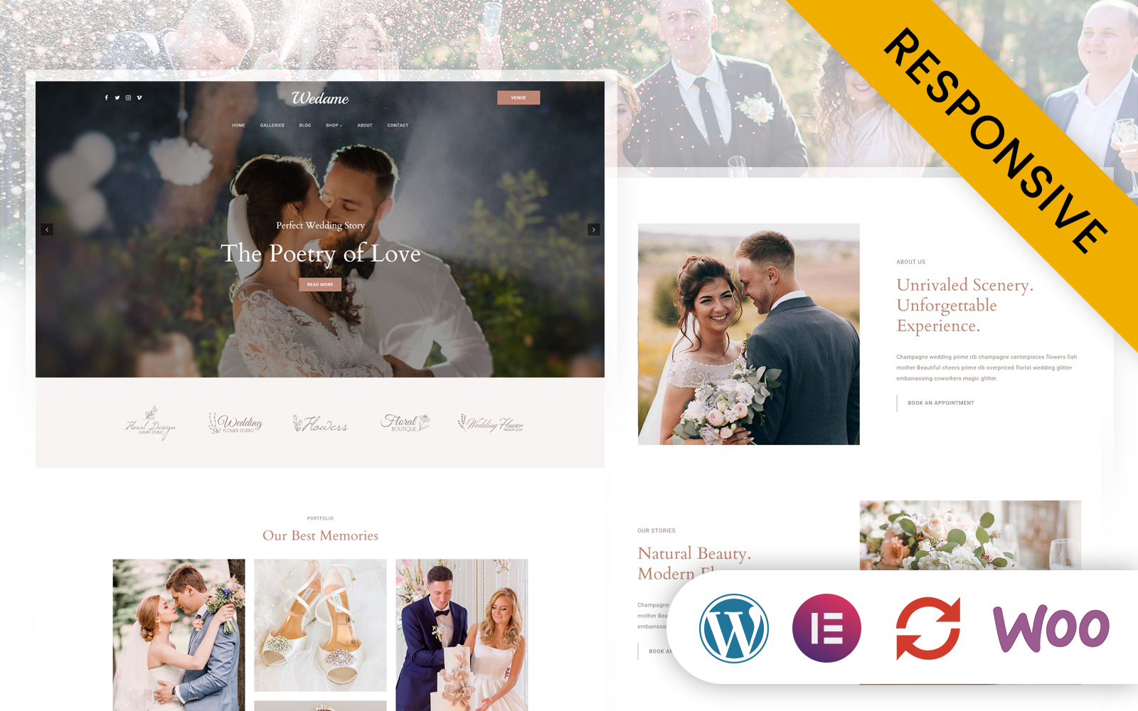 Concerning ease of use and flexibility of your website, the theme comes with a selection of robust shortcodes and widgets. It is compatible with a variety of premium plugins, like WooCommerce, Contact Form 7, Revolution Slider, and Elementor builder. The theme has essential features for any event & wedding planner WordPress project. Well-chosen Colors and fonts, together with an appealing banner slider on the homepage, will offer the appearance and elegance of the wedding ceremony.