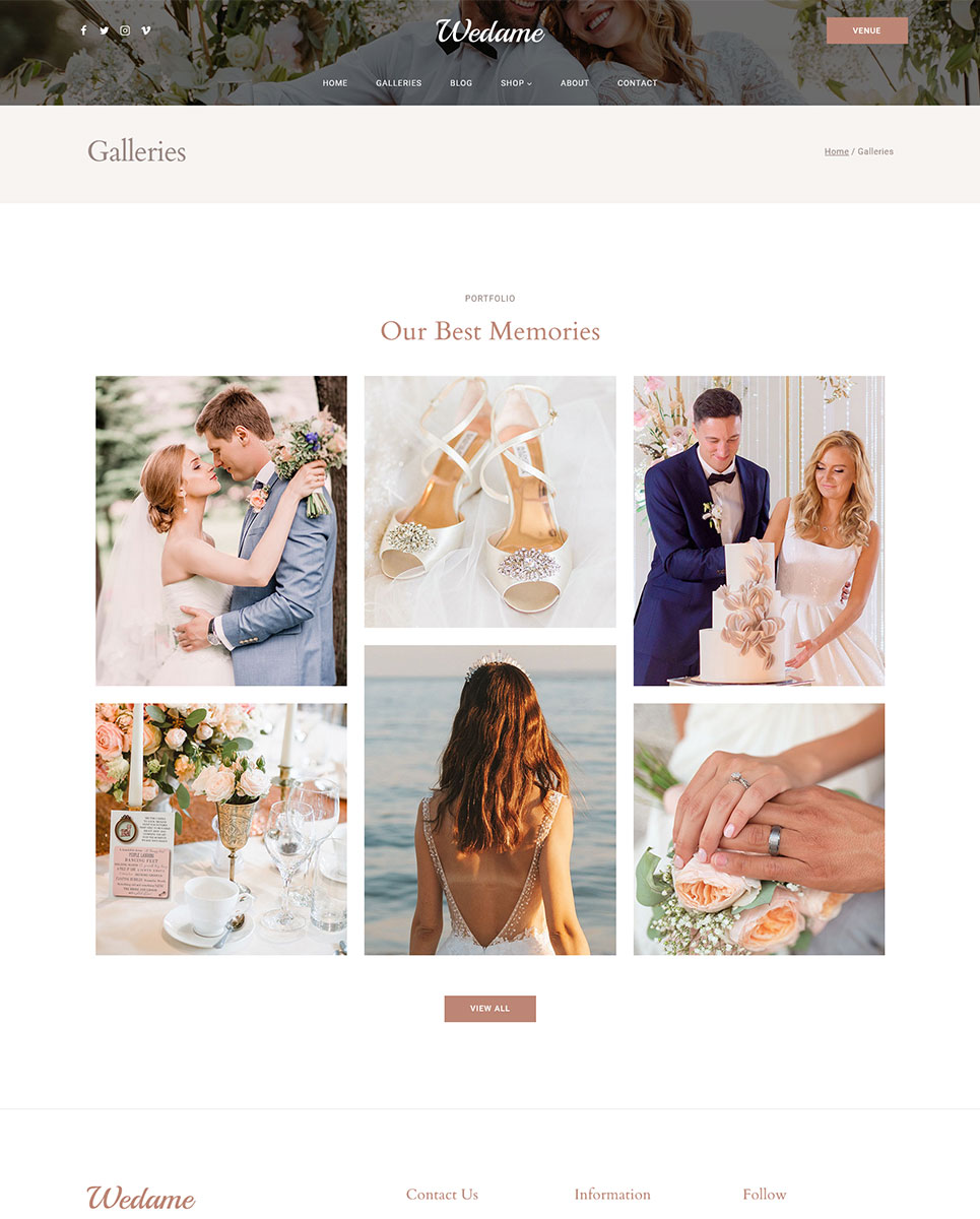 Wedame is a multipurpose wedding and event planning WordPress theme created for wedding planners and couples. This could be the perfect wedding website for you to showcase special events. Using the Elementor page builder, which we used to develop this theme's pages, you can add an unlimited number of sections to let you display the Venue, Wedding Date, Photo Gallery, About US and Story, Contact Information, Video section, and many more.
