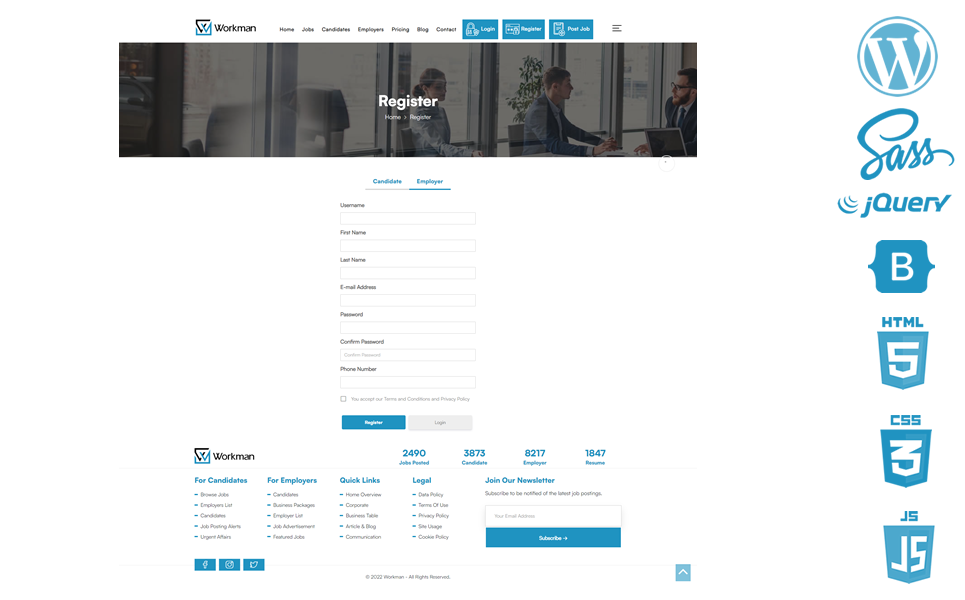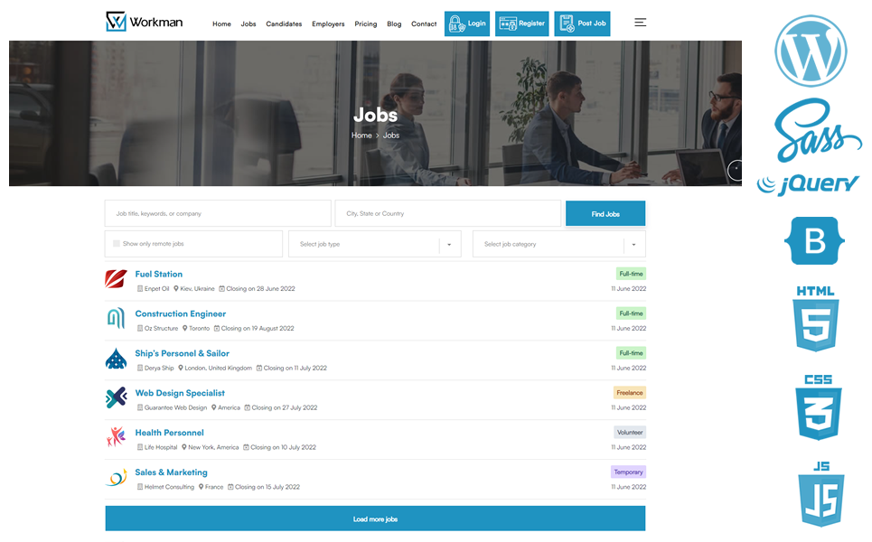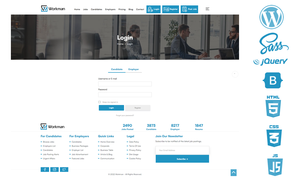 Workman WordPress Theme is a carefully developed Job Portal WordPress Theme for Job Seekers and Employers.