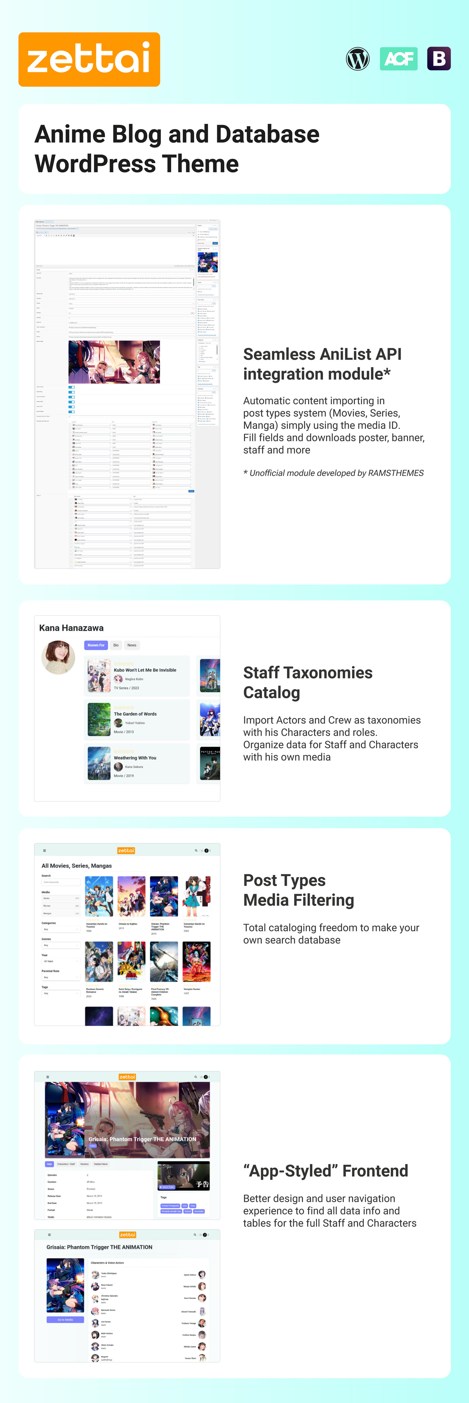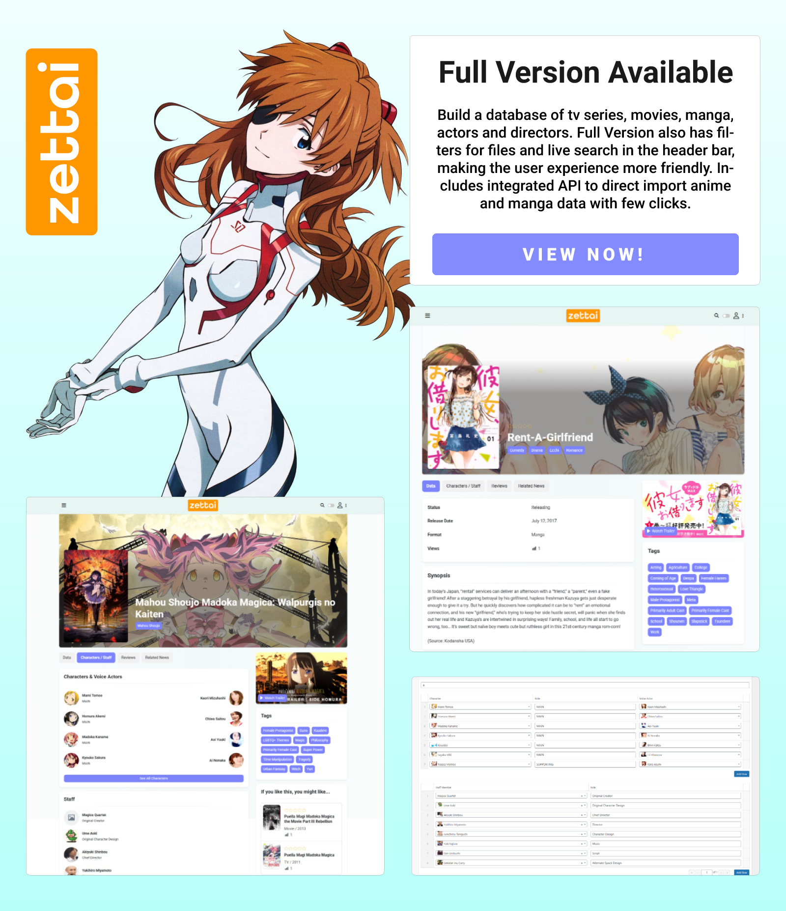 ZETTAI - Free Version is an entry version of our recent anime news, reviews and database theme, which contains basic functions to create your own anime news site with Advanced Custom Fields. This version, designed so that users can test the style and essential functions of the template, allows creating posts, reviews, and making a basic cataloging of anime series and movies, as well as voice actors and staff. Being a free template, it does NOT include support. To enjoy the full version of ZETTAI, try all the functions and access the support, you can get it by clicking on the descriptive image above.